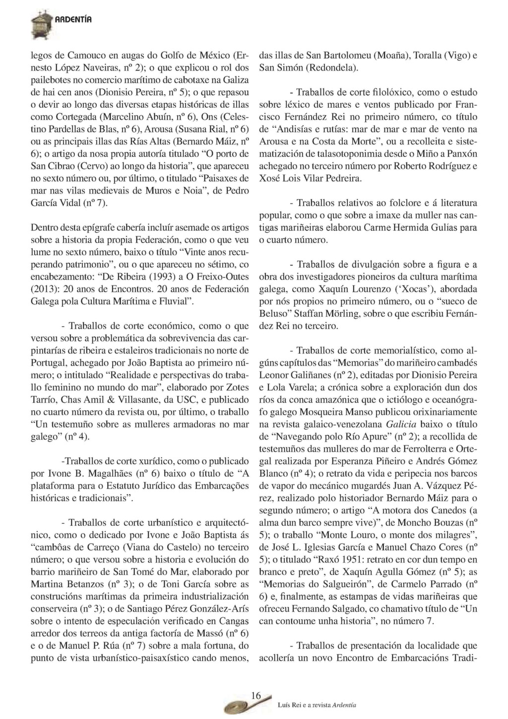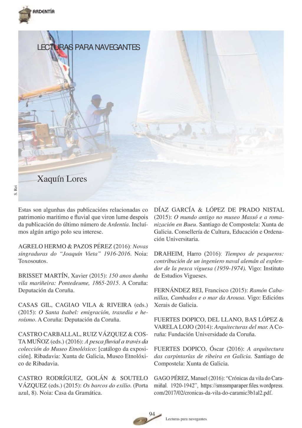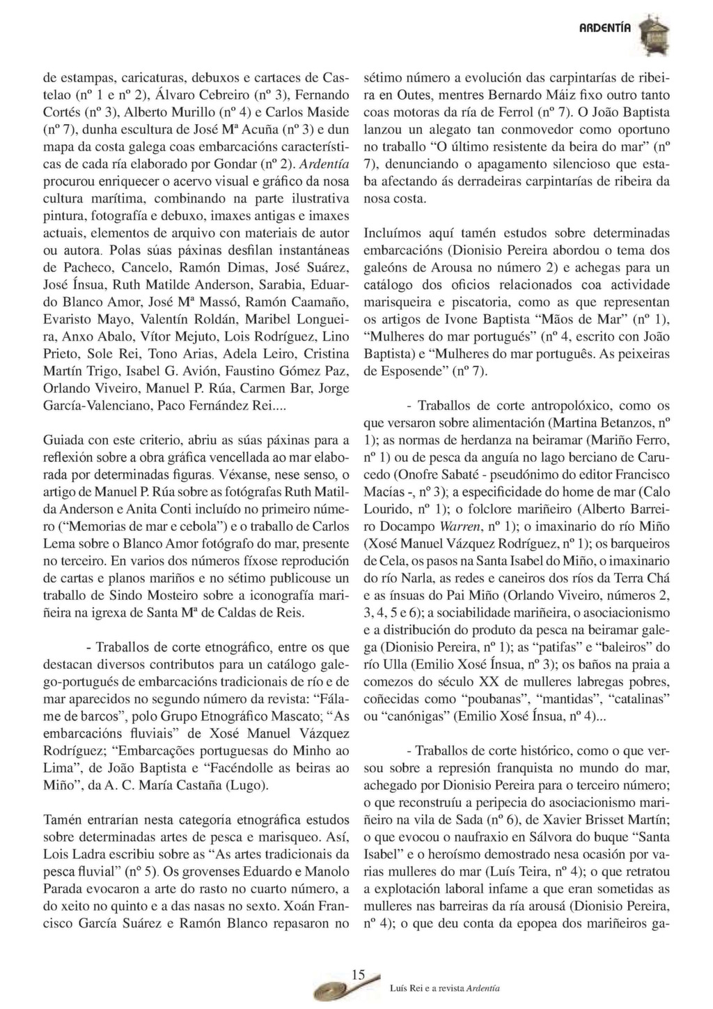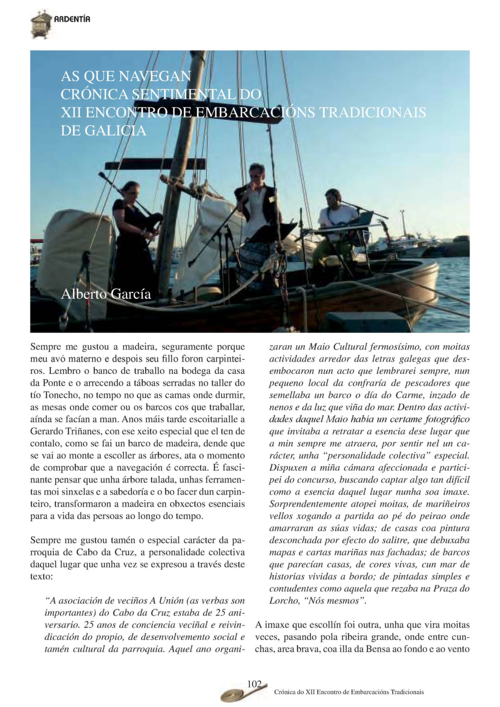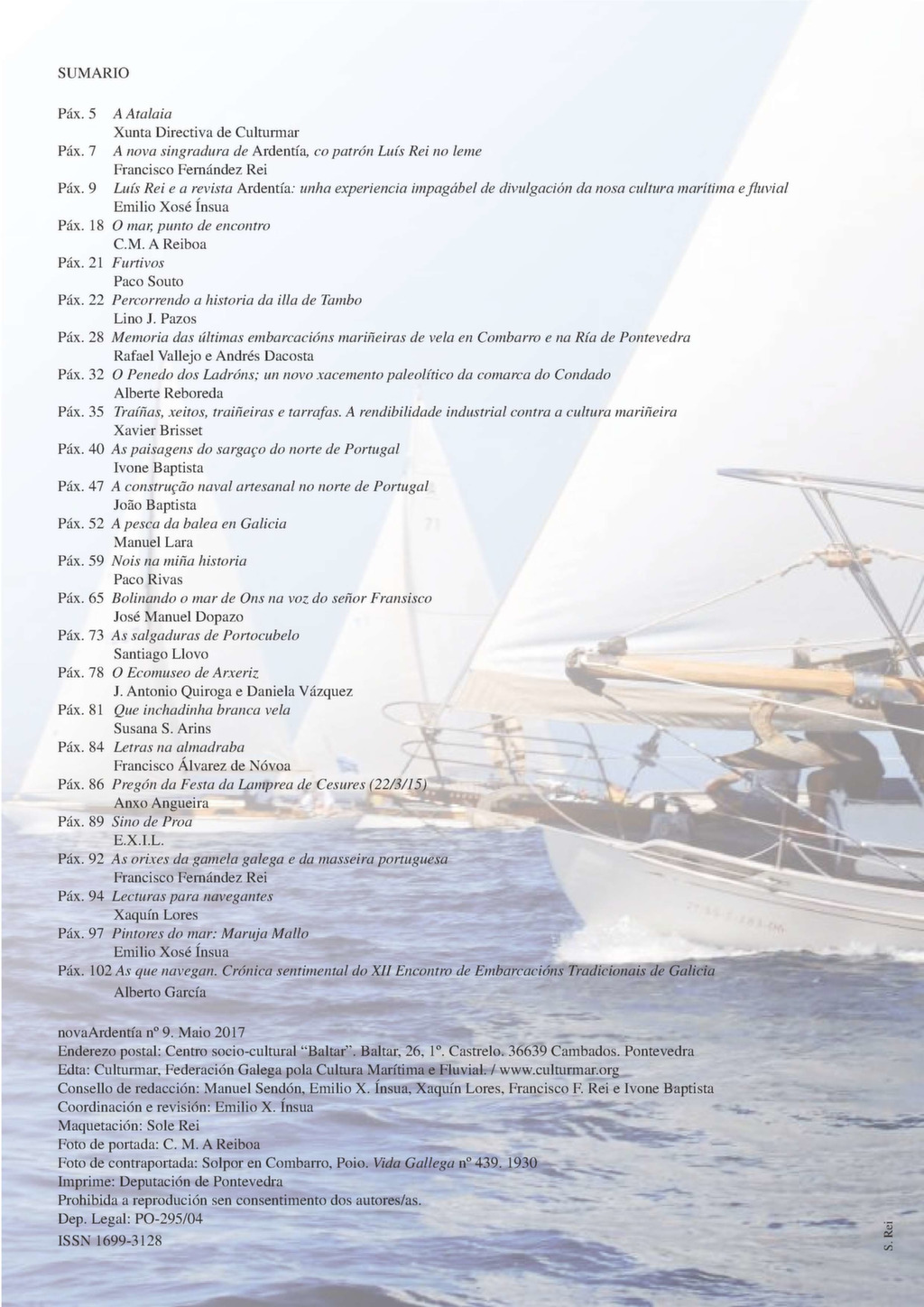 A Atalaia | A nova singradura de Ardentía, co patrón Luís Rei no Leme | Luís Rei e a revista Ardentía: unha experiencia impagábel de divulgación da nosa cultura marítima e fluvial | O mar; punto de encontro | Furtivos | Percorrendo a historia da illa de Tambo | Memoria das últimas embarcacións mariñeiras de vela en Combarro e na Ría de Pontevedra | O Penendo dos Ladróns; un novo xacemento paleolítico da comarca do Condado | Traíñas, xeitos, traiñeiras e tarrafas. A rendabilidade industrial contra a cultura mariñeira | As paisagens do sargaço do norte de Portugal | A pesca da balea en Galicia | Nois na miña memoria | Bolinando o mar de Ons na voz do señor Francisco | As salgaduras de Portocubelo | O Ecomuseo de Arxeriz | Que inchadiña branca vela | Letras na almadraba | Pregón da Festa da Lamprea de Cesures | Sino de Proa | As orixes da gamela galega e da masseira portuguesa | Lecturas para navegantes | Pintores do mar: Maruja Mallo | As que navegan. Crónica sentimental do XII Encontro de Embarcacións Tradicionais de Galicia