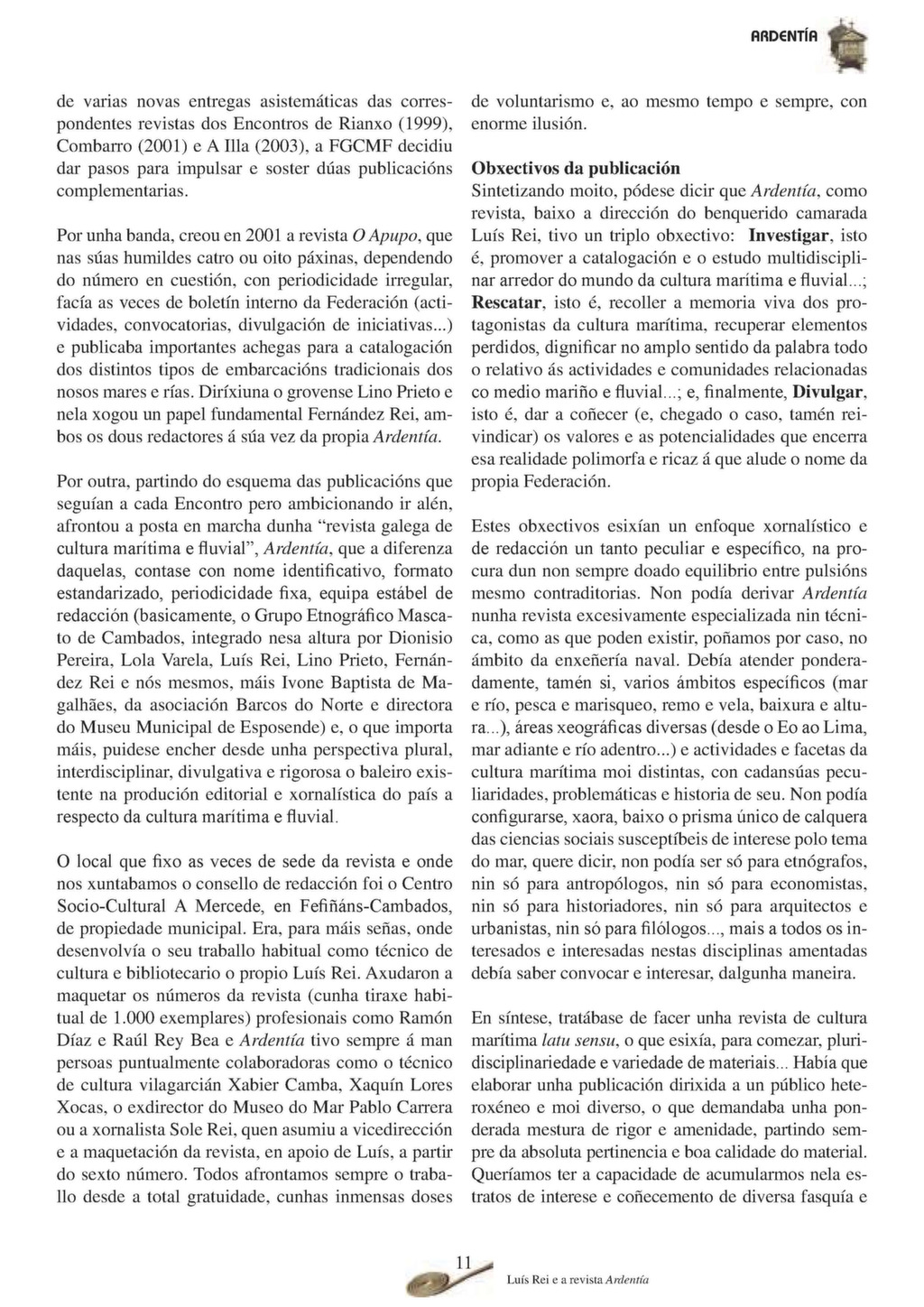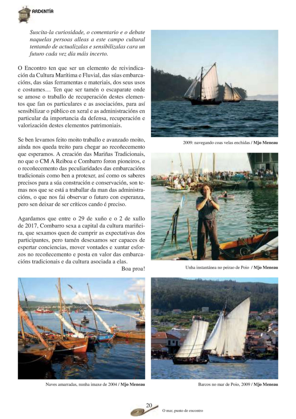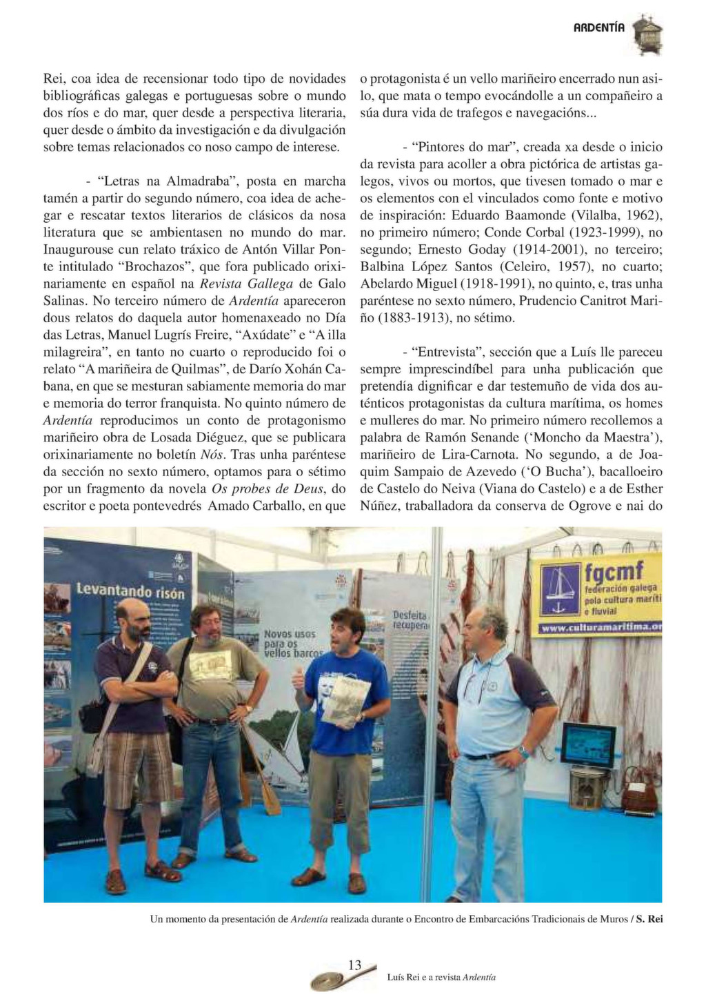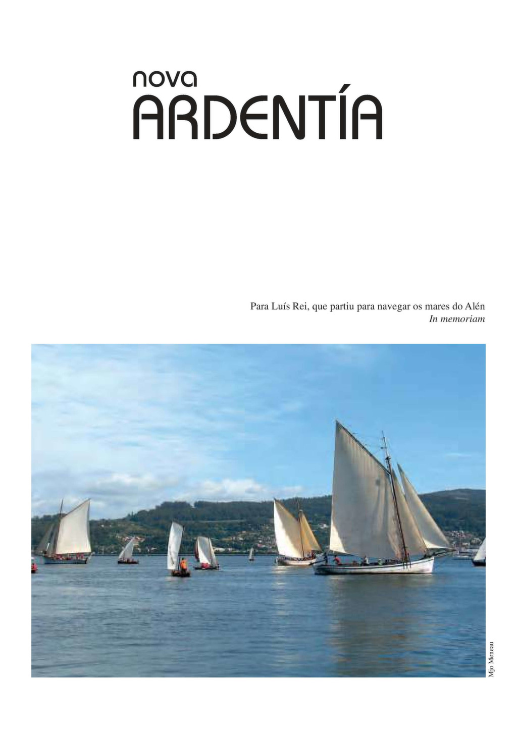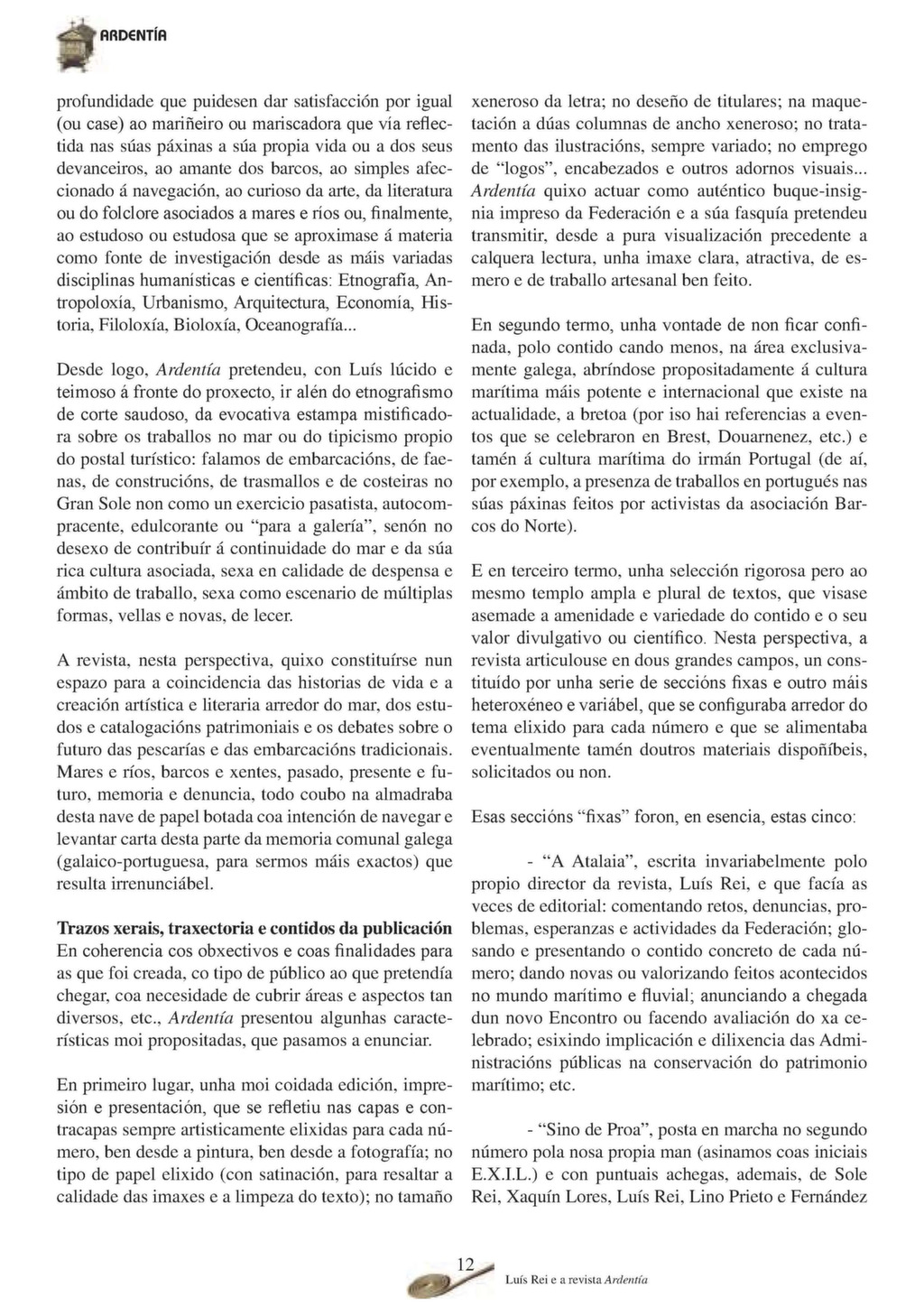A Atalaia | A nova singradura de Ardentía, co patrón Luís Rei no Leme | Luís Rei e a revista Ardentía: unha experiencia impagábel de divulgación da nosa cultura marítima e fluvial | O mar; punto de encontro | Furtivos | Percorrendo a historia da illa de Tambo | Memoria das últimas embarcacións mariñeiras de vela en Combarro e na Ría de Pontevedra | O Penendo dos Ladróns; un novo xacemento paleolítico da comarca do Condado | Traíñas, xeitos, traiñeiras e tarrafas. A rendabilidade industrial contra a cultura mariñeira | As paisagens do sargaço do norte de Portugal | A pesca da balea en Galicia | Nois na miña memoria | Bolinando o mar de Ons na voz do señor Francisco | As salgaduras de Portocubelo | O Ecomuseo de Arxeriz | Que inchadiña branca vela | Letras na almadraba | Pregón da Festa da Lamprea de Cesures | Sino de Proa | As orixes da gamela galega e da masseira portuguesa | Lecturas para navegantes | Pintores do mar: Maruja Mallo | As que navegan. Crónica sentimental do XII Encontro de Embarcacións Tradicionais de Galicia