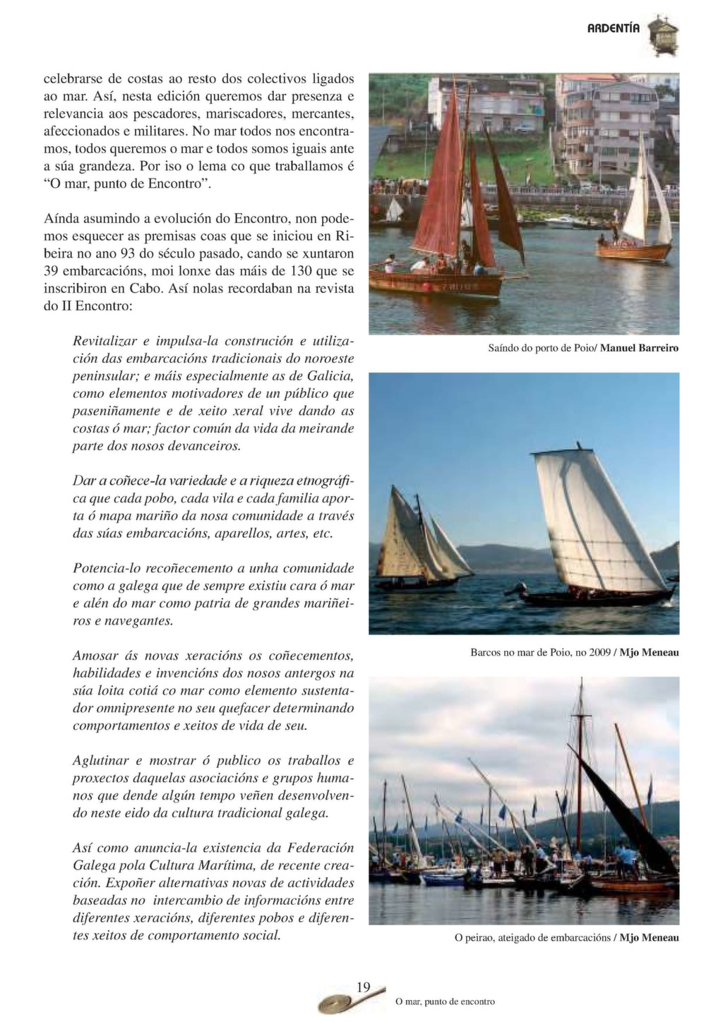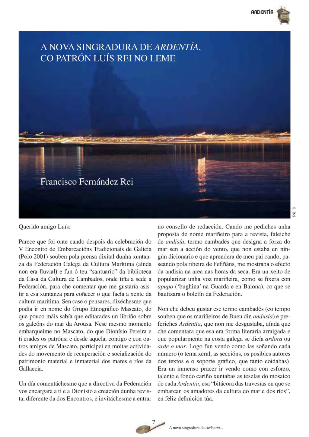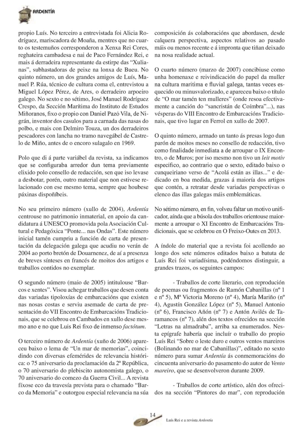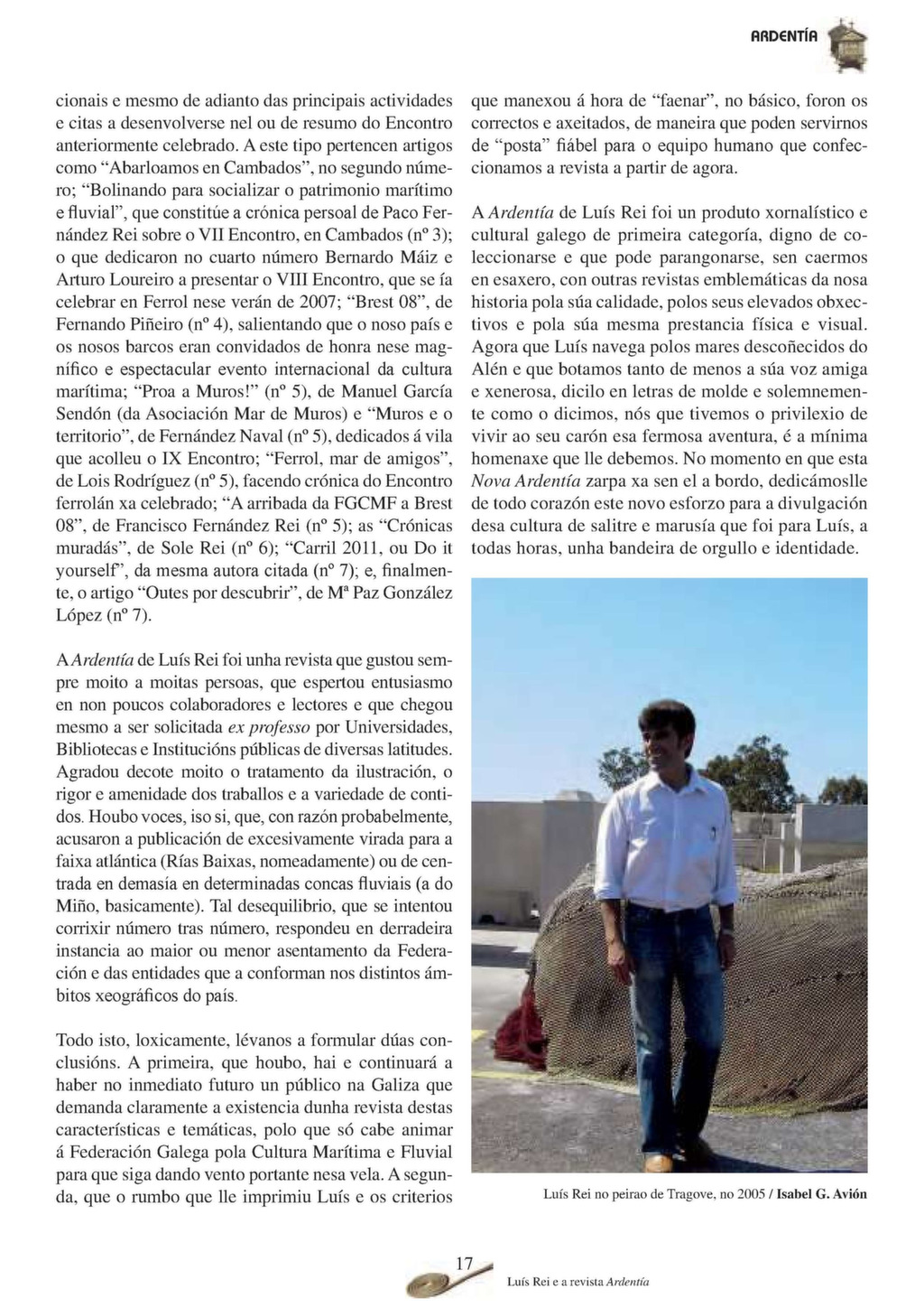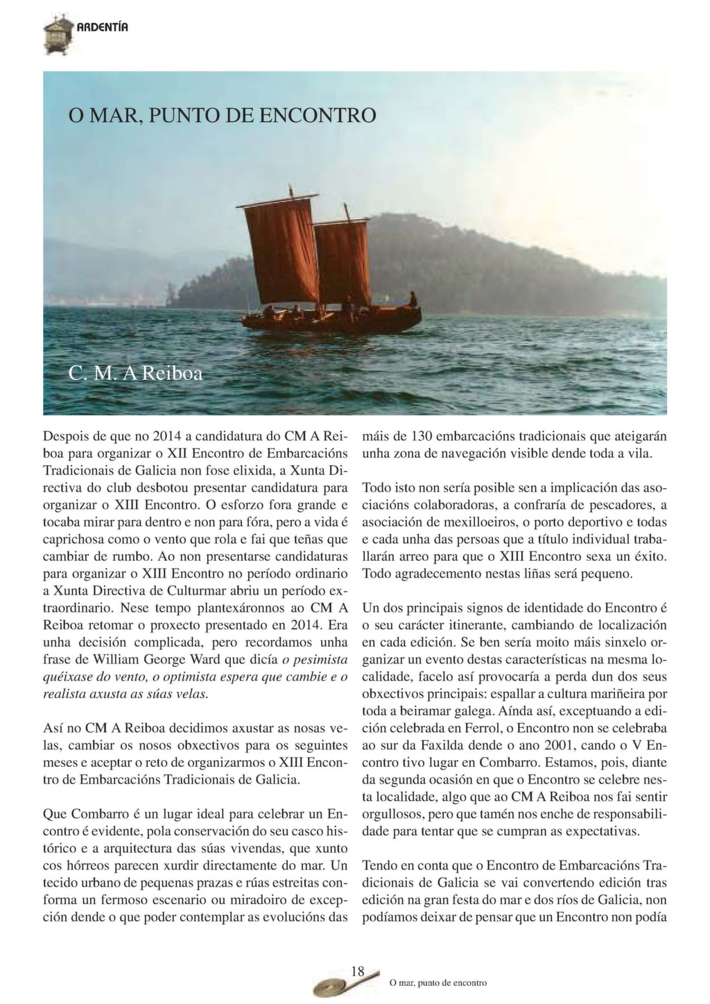A Atalaia | A nova singradura de Ardentía, co patrón Luís Rei no Leme | Luís Rei e a revista Ardentía: unha experiencia impagábel de divulgación da nosa cultura marítima e fluvial | O mar; punto de encontro | Furtivos | Percorrendo a historia da illa de Tambo | Memoria das últimas embarcacións mariñeiras de vela en Combarro e na Ría de Pontevedra | O Penendo dos Ladróns; un novo xacemento paleolítico da comarca do Condado | Traíñas, xeitos, traiñeiras e tarrafas. A rendabilidade industrial contra a cultura mariñeira | As paisagens do sargaço do norte de Portugal | A pesca da balea en Galicia | Nois na miña memoria | Bolinando o mar de Ons na voz do señor Francisco | As salgaduras de Portocubelo | O Ecomuseo de Arxeriz | Que inchadiña branca vela | Letras na almadraba | Pregón da Festa da Lamprea de Cesures | Sino de Proa | As orixes da gamela galega e da masseira portuguesa | Lecturas para navegantes | Pintores do mar: Maruja Mallo | As que navegan. Crónica sentimental do XII Encontro de Embarcacións Tradicionais de Galicia