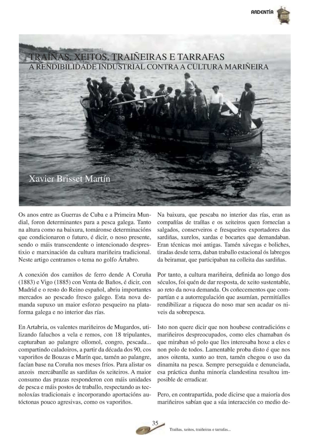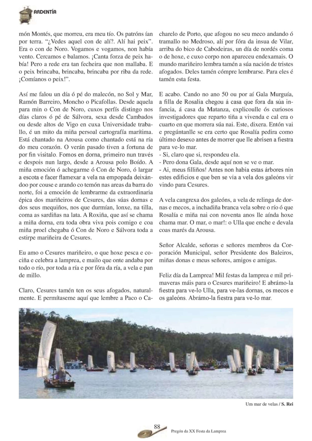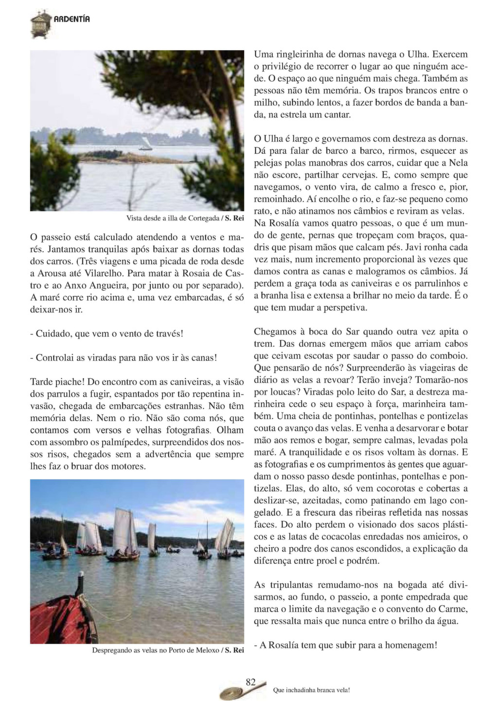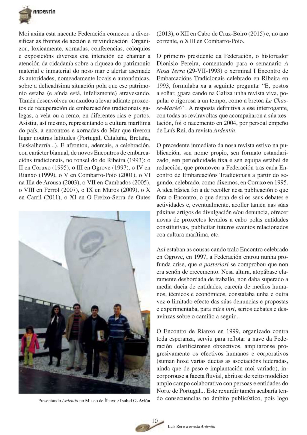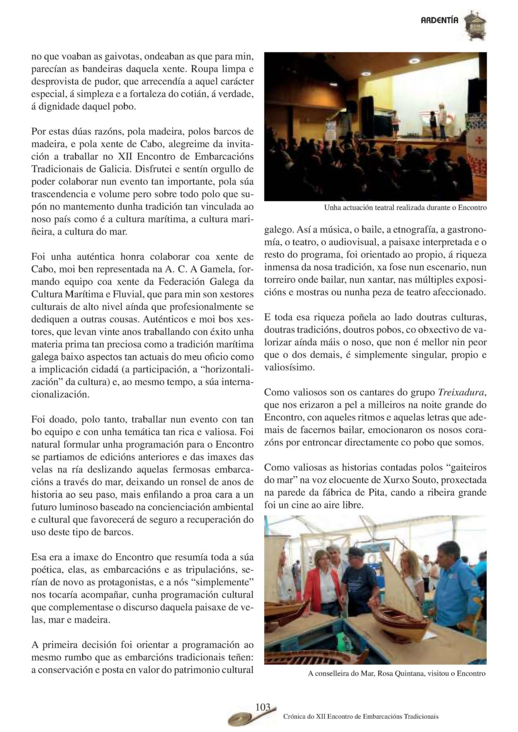 A Atalaia | A nova singradura de Ardentía, co patrón Luís Rei no Leme | Luís Rei e a revista Ardentía: unha experiencia impagábel de divulgación da nosa cultura marítima e fluvial | O mar; punto de encontro | Furtivos | Percorrendo a historia da illa de Tambo | Memoria das últimas embarcacións mariñeiras de vela en Combarro e na Ría de Pontevedra | O Penendo dos Ladróns; un novo xacemento paleolítico da comarca do Condado | Traíñas, xeitos, traiñeiras e tarrafas. A rendabilidade industrial contra a cultura mariñeira | As paisagens do sargaço do norte de Portugal | A pesca da balea en Galicia | Nois na miña memoria | Bolinando o mar de Ons na voz do señor Francisco | As salgaduras de Portocubelo | O Ecomuseo de Arxeriz | Que inchadiña branca vela | Letras na almadraba | Pregón da Festa da Lamprea de Cesures | Sino de Proa | As orixes da gamela galega e da masseira portuguesa | Lecturas para navegantes | Pintores do mar: Maruja Mallo | As que navegan. Crónica sentimental do XII Encontro de Embarcacións Tradicionais de Galicia