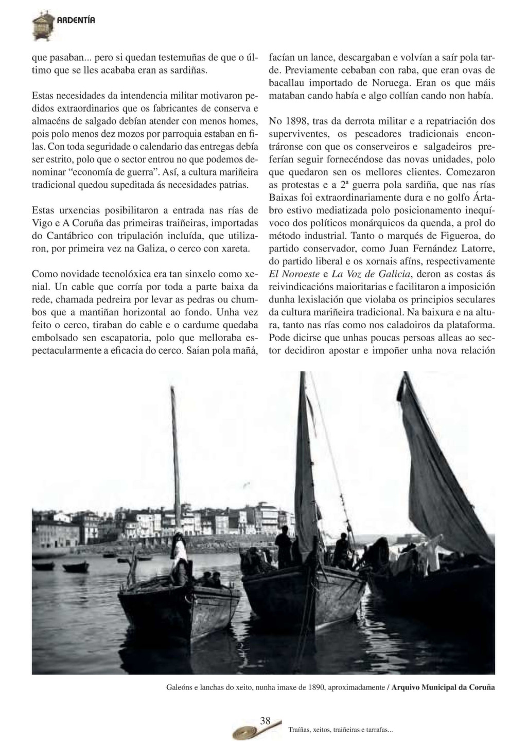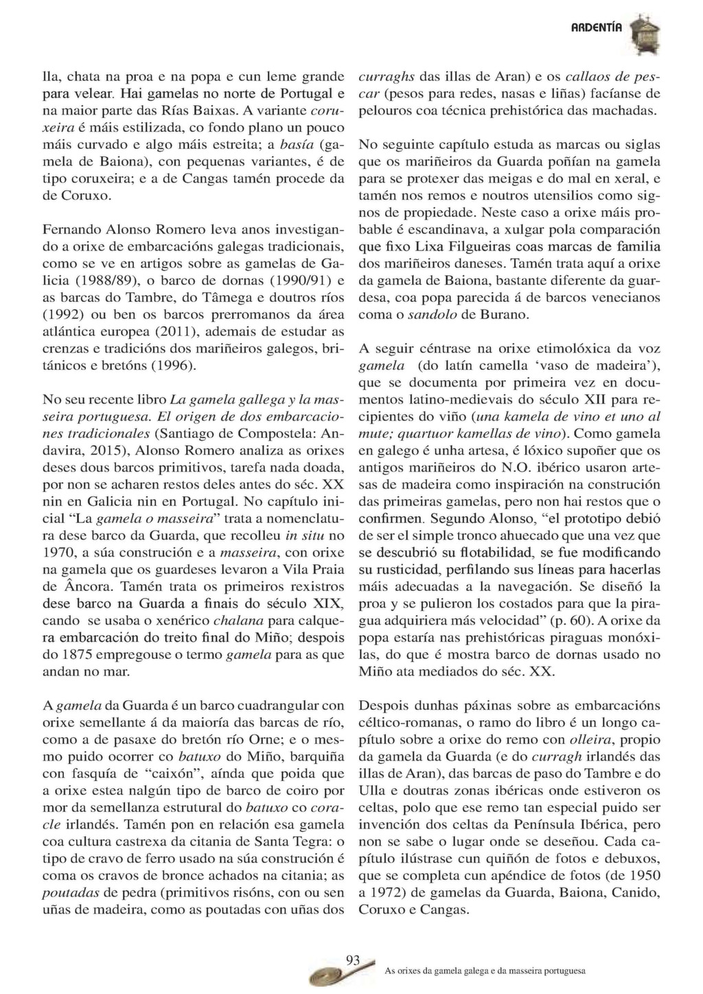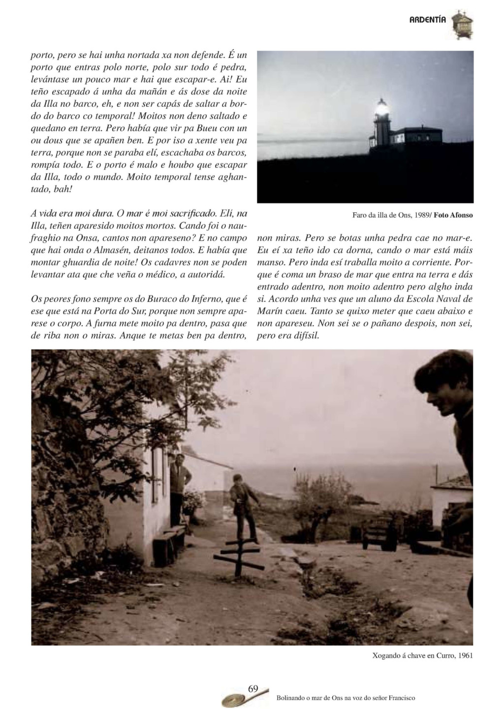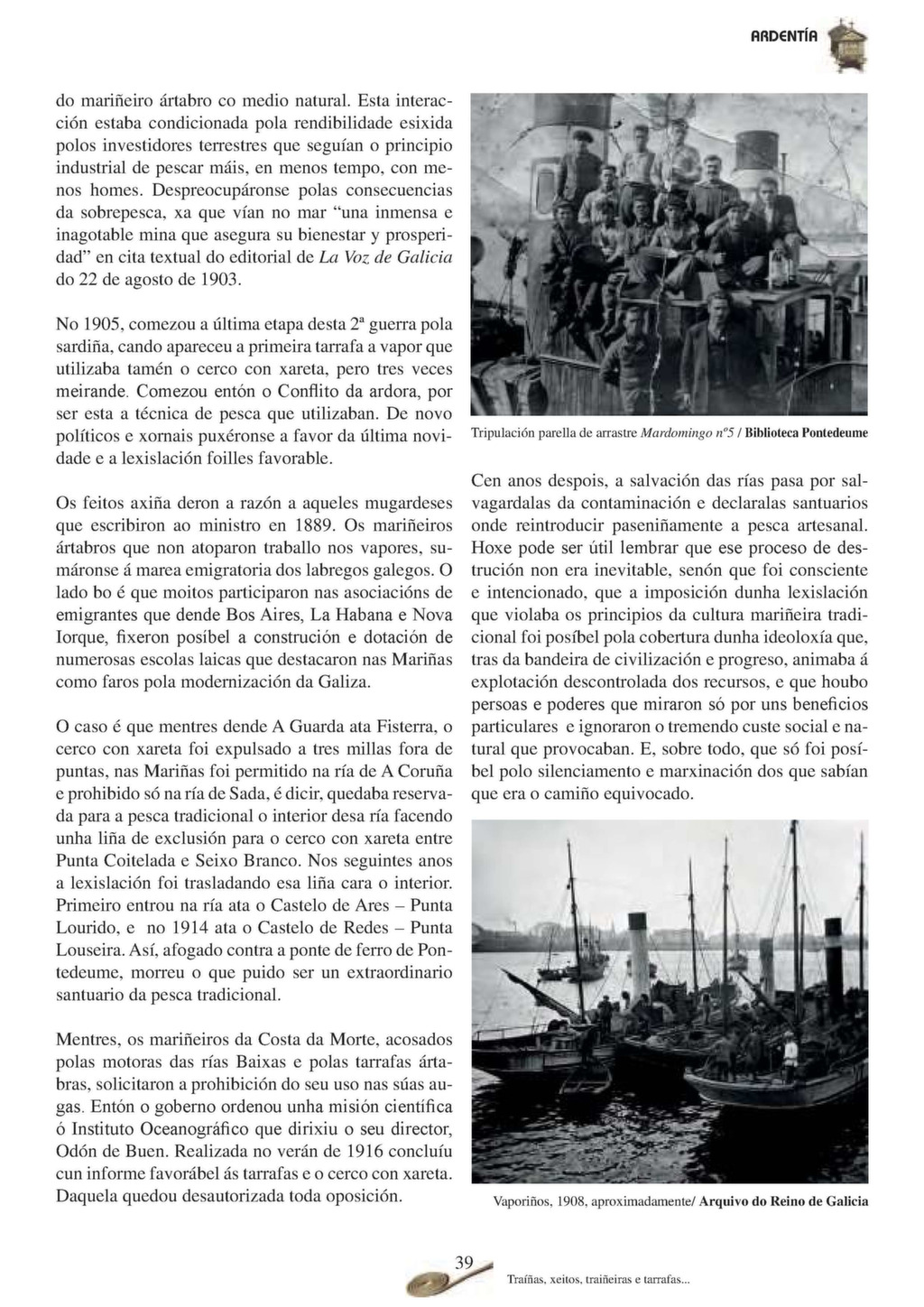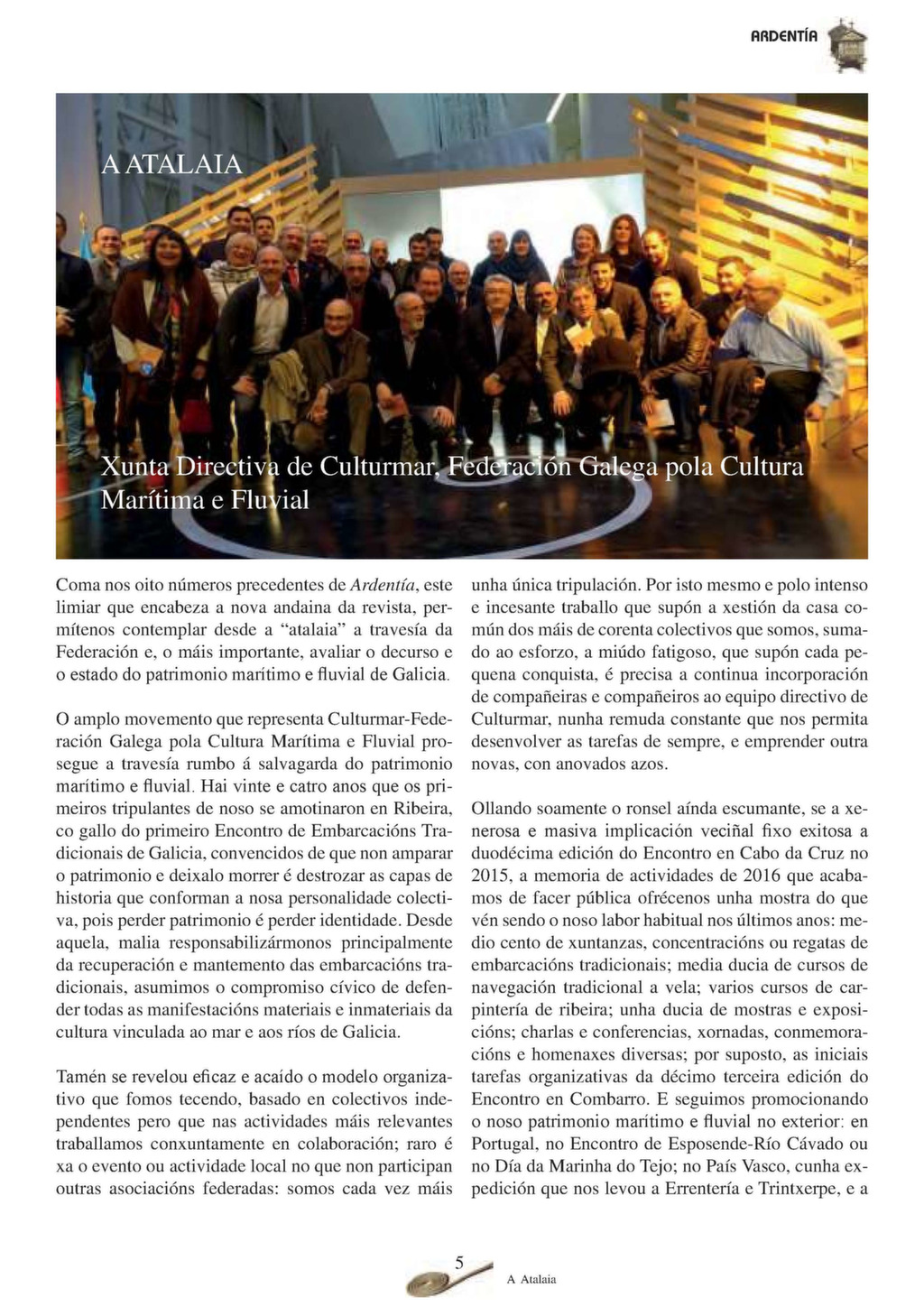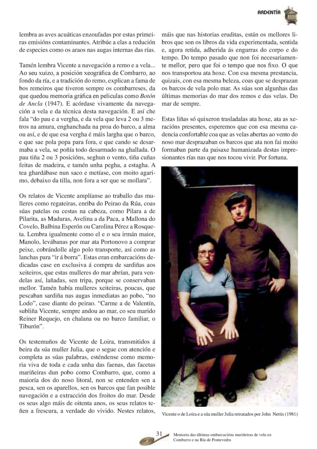 A Atalaia | A nova singradura de Ardentía, co patrón Luís Rei no Leme | Luís Rei e a revista Ardentía: unha experiencia impagábel de divulgación da nosa cultura marítima e fluvial | O mar; punto de encontro | Furtivos | Percorrendo a historia da illa de Tambo | Memoria das últimas embarcacións mariñeiras de vela en Combarro e na Ría de Pontevedra | O Penendo dos Ladróns; un novo xacemento paleolítico da comarca do Condado | Traíñas, xeitos, traiñeiras e tarrafas. A rendabilidade industrial contra a cultura mariñeira | As paisagens do sargaço do norte de Portugal | A pesca da balea en Galicia | Nois na miña memoria | Bolinando o mar de Ons na voz do señor Francisco | As salgaduras de Portocubelo | O Ecomuseo de Arxeriz | Que inchadiña branca vela | Letras na almadraba | Pregón da Festa da Lamprea de Cesures | Sino de Proa | As orixes da gamela galega e da masseira portuguesa | Lecturas para navegantes | Pintores do mar: Maruja Mallo | As que navegan. Crónica sentimental do XII Encontro de Embarcacións Tradicionais de Galicia