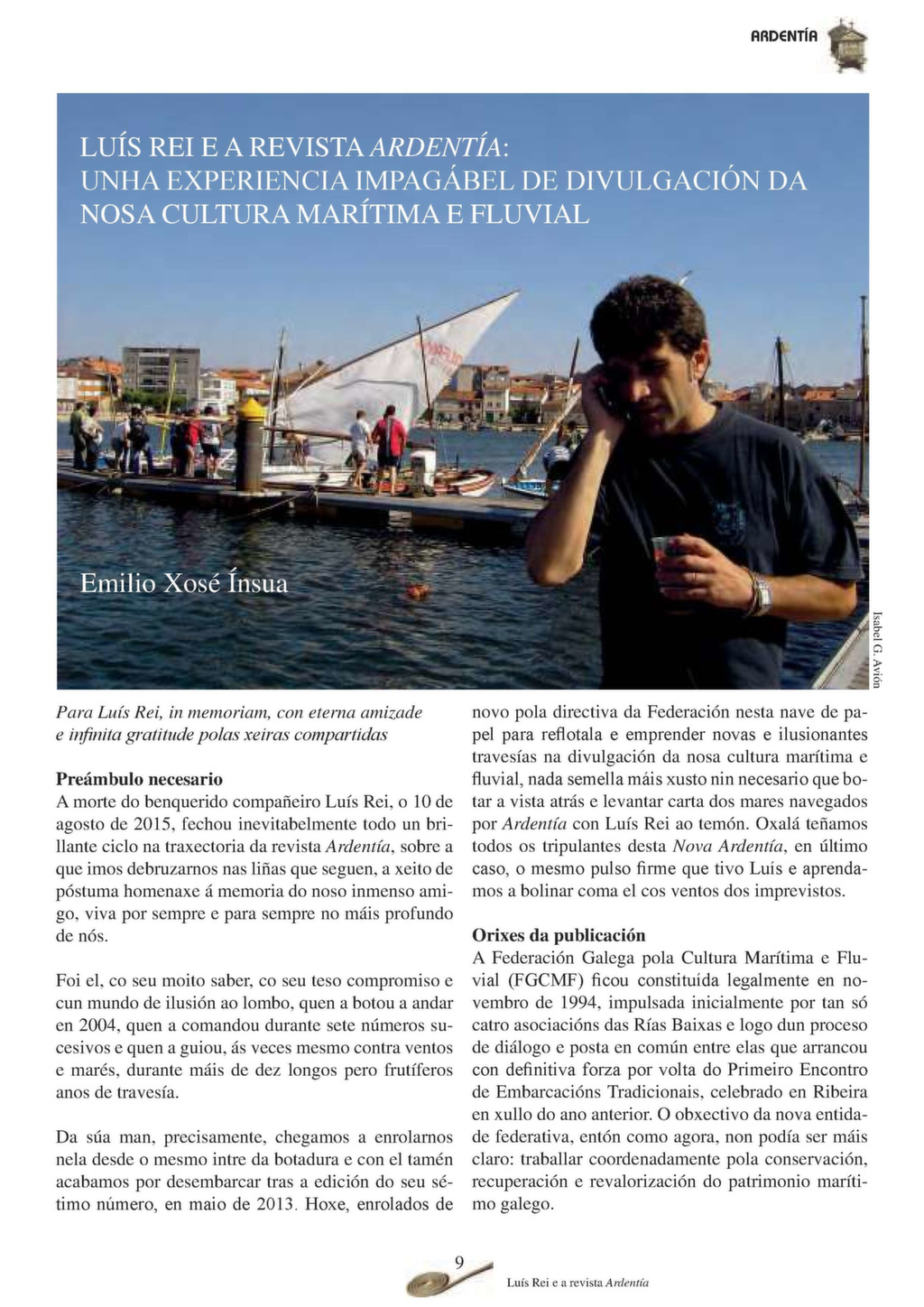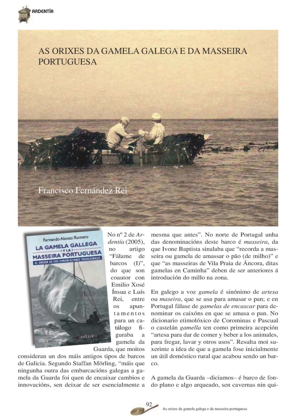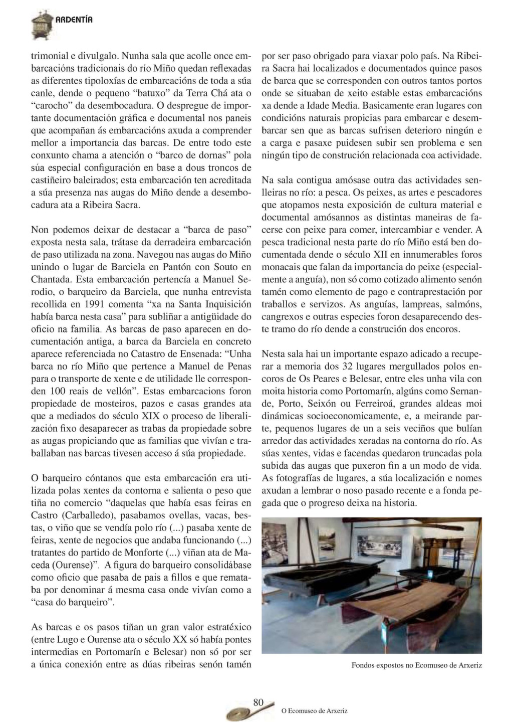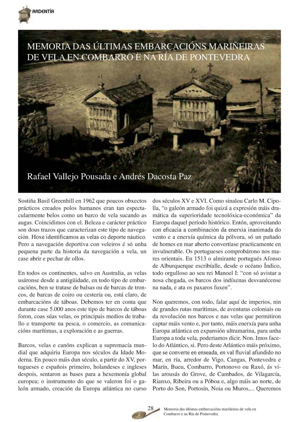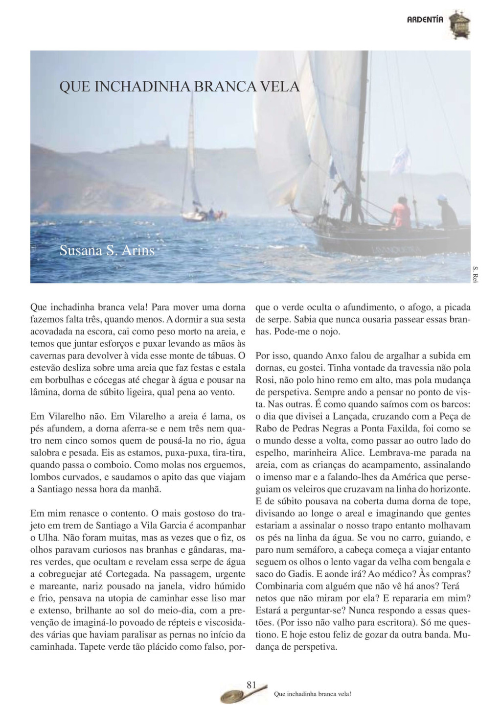 A Atalaia | A nova singradura de Ardentía, co patrón Luís Rei no Leme | Luís Rei e a revista Ardentía: unha experiencia impagábel de divulgación da nosa cultura marítima e fluvial | O mar; punto de encontro | Furtivos | Percorrendo a historia da illa de Tambo | Memoria das últimas embarcacións mariñeiras de vela en Combarro e na Ría de Pontevedra | O Penendo dos Ladróns; un novo xacemento paleolítico da comarca do Condado | Traíñas, xeitos, traiñeiras e tarrafas. A rendabilidade industrial contra a cultura mariñeira | As paisagens do sargaço do norte de Portugal | A pesca da balea en Galicia | Nois na miña memoria | Bolinando o mar de Ons na voz do señor Francisco | As salgaduras de Portocubelo | O Ecomuseo de Arxeriz | Que inchadiña branca vela | Letras na almadraba | Pregón da Festa da Lamprea de Cesures | Sino de Proa | As orixes da gamela galega e da masseira portuguesa | Lecturas para navegantes | Pintores do mar: Maruja Mallo | As que navegan. Crónica sentimental do XII Encontro de Embarcacións Tradicionais de Galicia