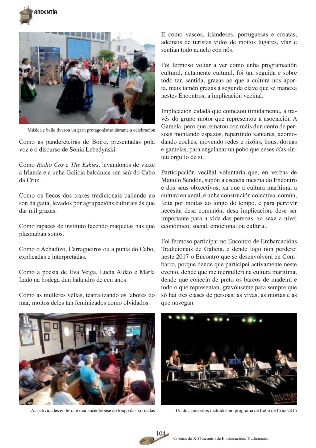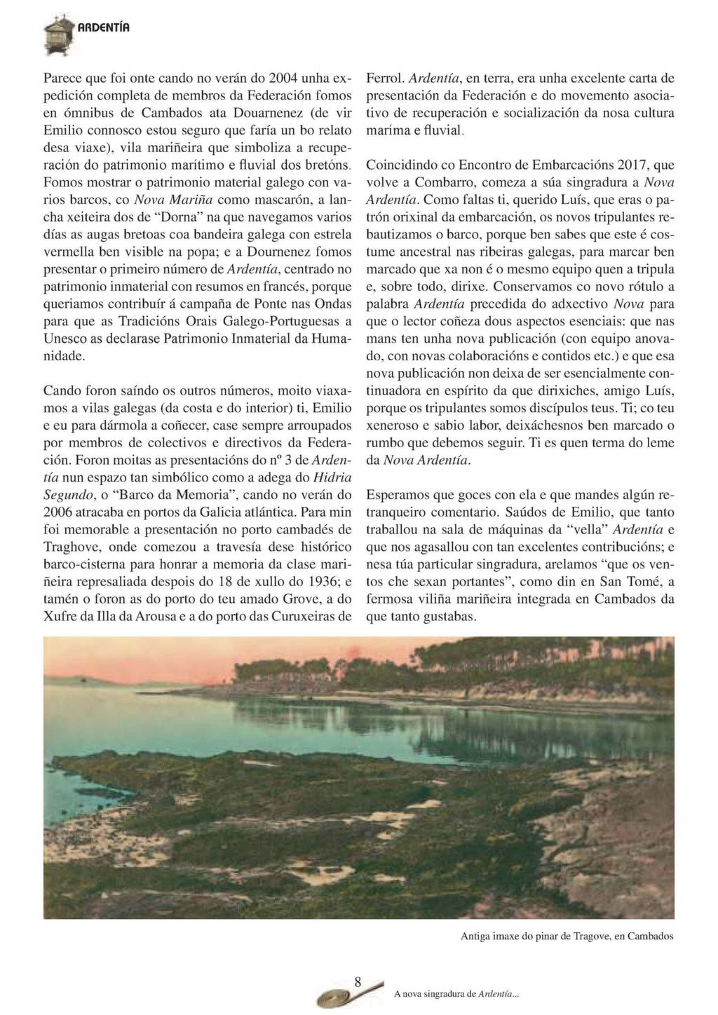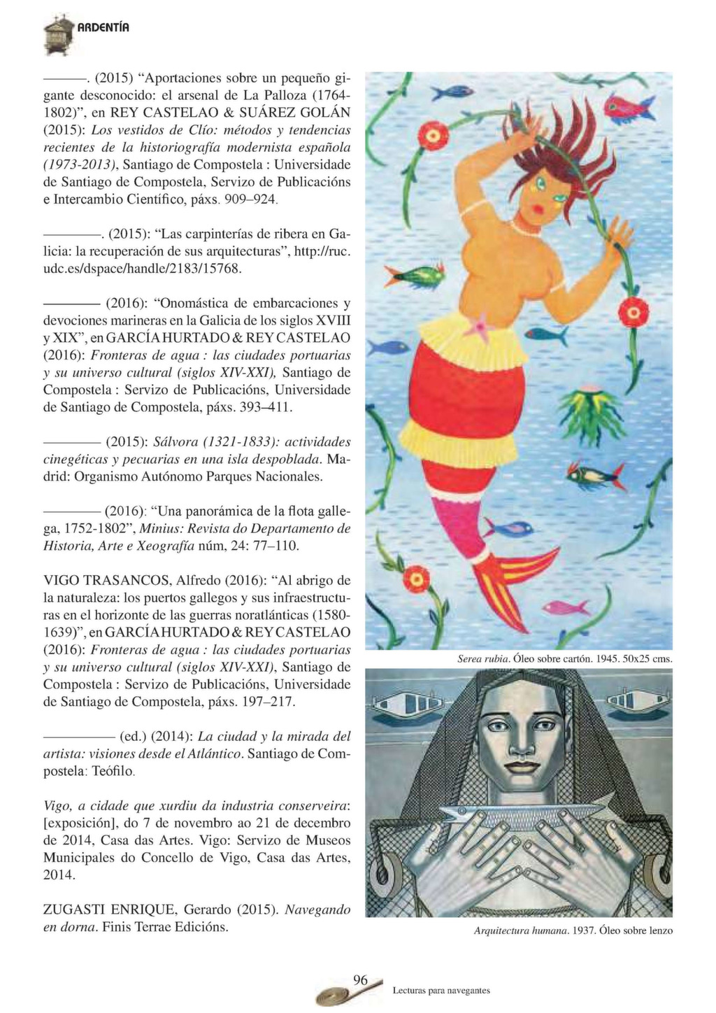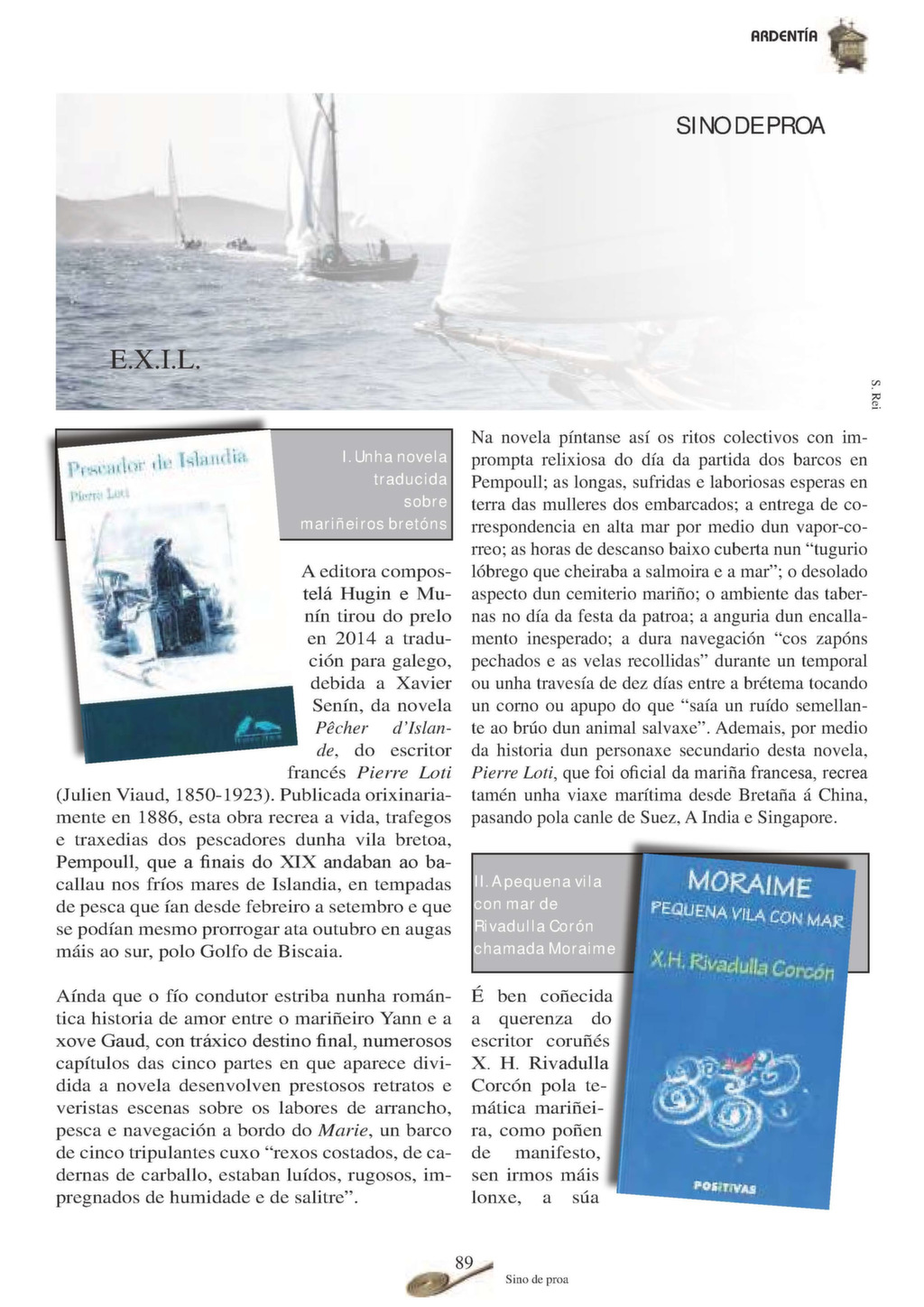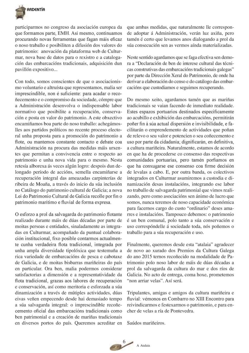 A Atalaia | A nova singradura de Ardentía, co patrón Luís Rei no Leme | Luís Rei e a revista Ardentía: unha experiencia impagábel de divulgación da nosa cultura marítima e fluvial | O mar; punto de encontro | Furtivos | Percorrendo a historia da illa de Tambo | Memoria das últimas embarcacións mariñeiras de vela en Combarro e na Ría de Pontevedra | O Penendo dos Ladróns; un novo xacemento paleolítico da comarca do Condado | Traíñas, xeitos, traiñeiras e tarrafas. A rendabilidade industrial contra a cultura mariñeira | As paisagens do sargaço do norte de Portugal | A pesca da balea en Galicia | Nois na miña memoria | Bolinando o mar de Ons na voz do señor Francisco | As salgaduras de Portocubelo | O Ecomuseo de Arxeriz | Que inchadiña branca vela | Letras na almadraba | Pregón da Festa da Lamprea de Cesures | Sino de Proa | As orixes da gamela galega e da masseira portuguesa | Lecturas para navegantes | Pintores do mar: Maruja Mallo | As que navegan. Crónica sentimental do XII Encontro de Embarcacións Tradicionais de Galicia