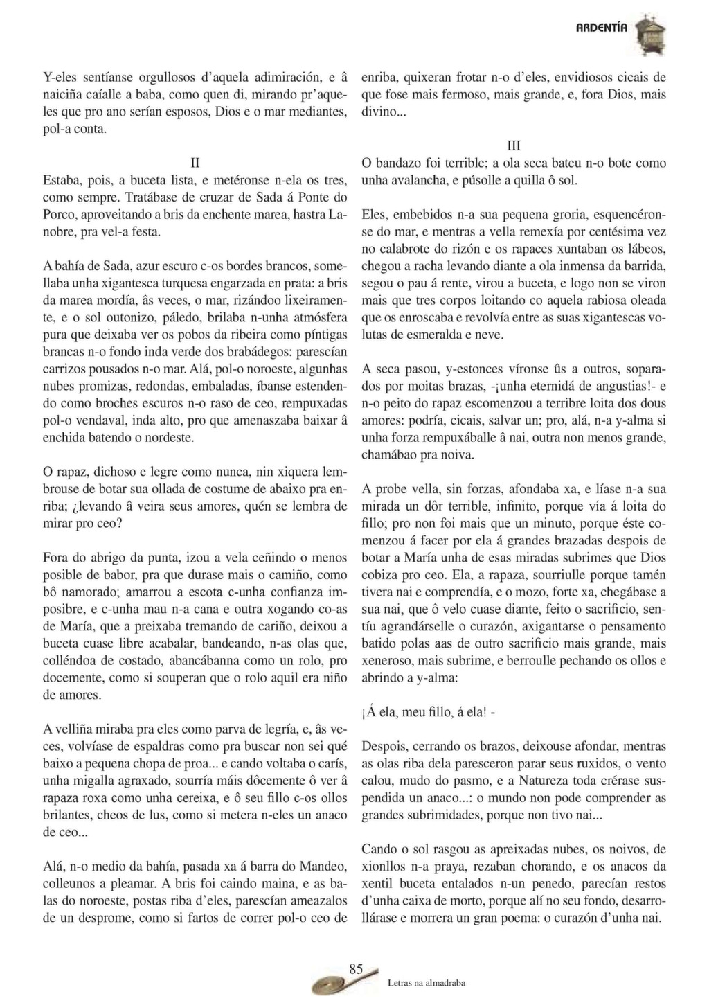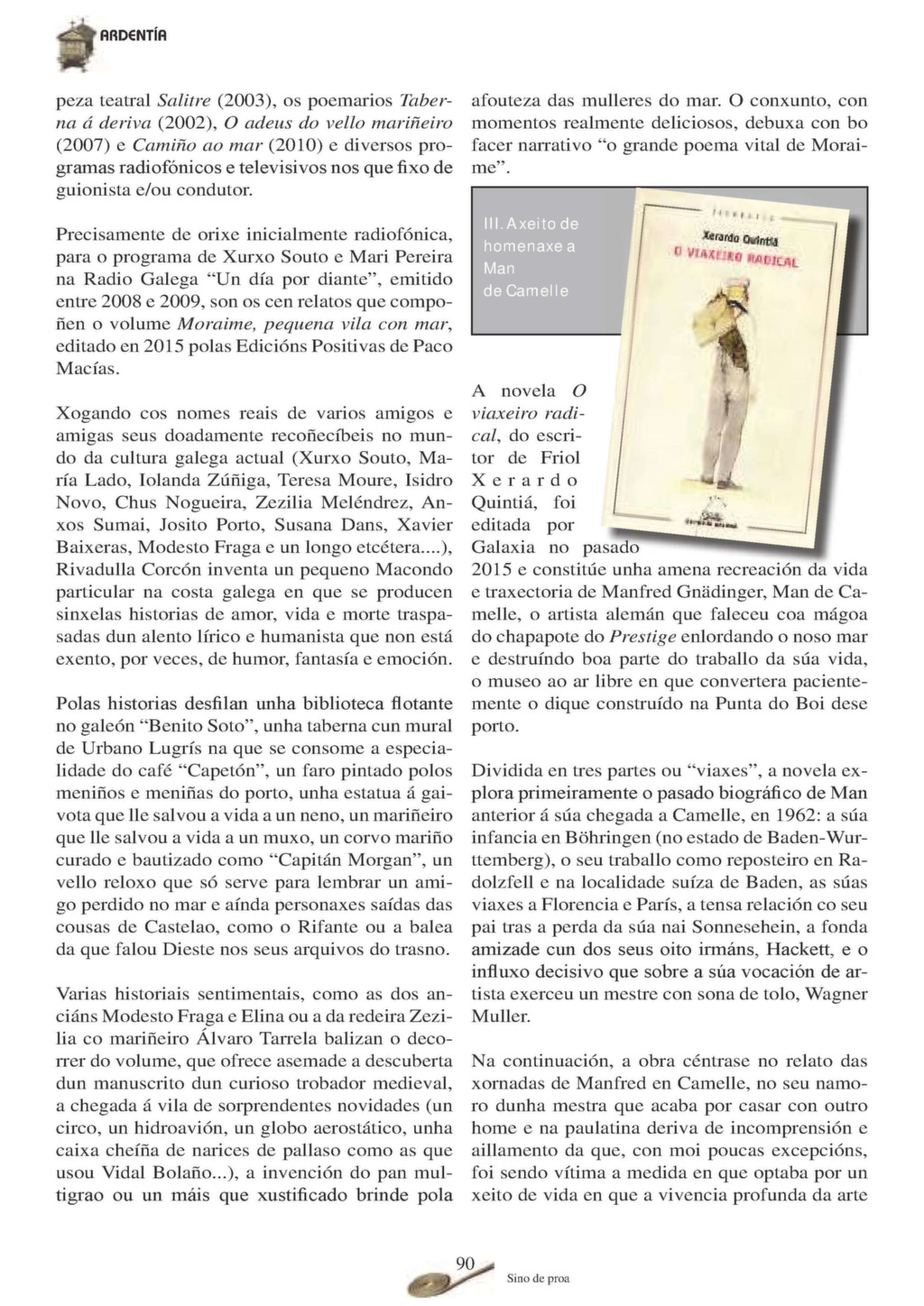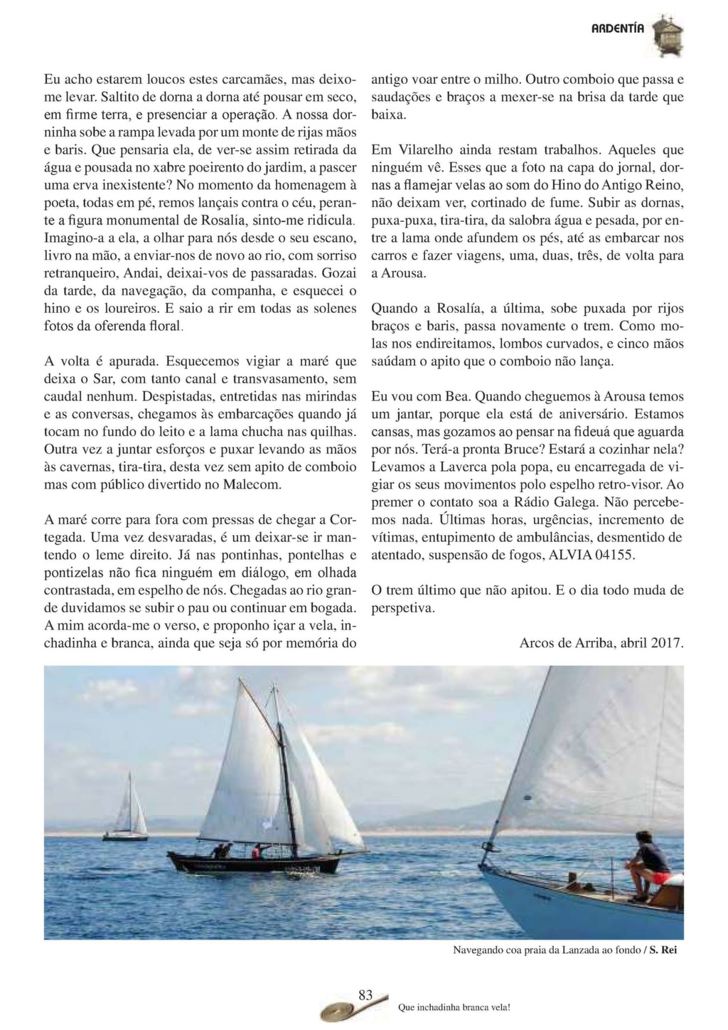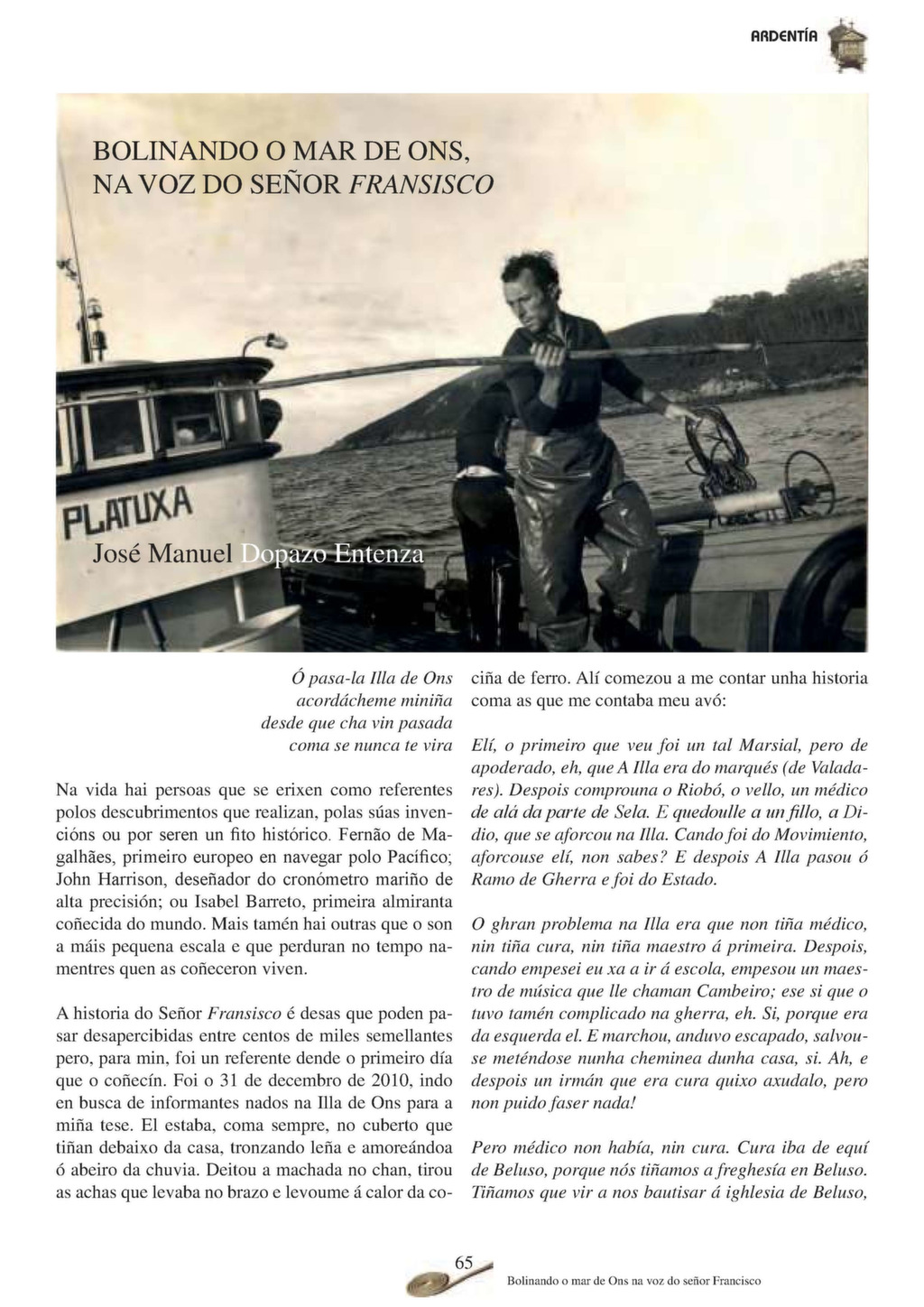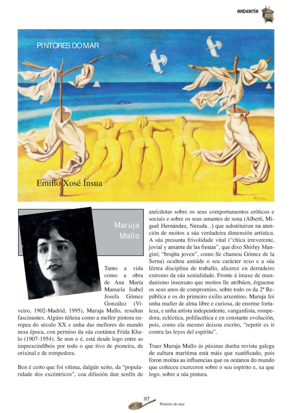 A Atalaia | A nova singradura de Ardentía, co patrón Luís Rei no Leme | Luís Rei e a revista Ardentía: unha experiencia impagábel de divulgación da nosa cultura marítima e fluvial | O mar; punto de encontro | Furtivos | Percorrendo a historia da illa de Tambo | Memoria das últimas embarcacións mariñeiras de vela en Combarro e na Ría de Pontevedra | O Penendo dos Ladróns; un novo xacemento paleolítico da comarca do Condado | Traíñas, xeitos, traiñeiras e tarrafas. A rendabilidade industrial contra a cultura mariñeira | As paisagens do sargaço do norte de Portugal | A pesca da balea en Galicia | Nois na miña memoria | Bolinando o mar de Ons na voz do señor Francisco | As salgaduras de Portocubelo | O Ecomuseo de Arxeriz | Que inchadiña branca vela | Letras na almadraba | Pregón da Festa da Lamprea de Cesures | Sino de Proa | As orixes da gamela galega e da masseira portuguesa | Lecturas para navegantes | Pintores do mar: Maruja Mallo | As que navegan. Crónica sentimental do XII Encontro de Embarcacións Tradicionais de Galicia