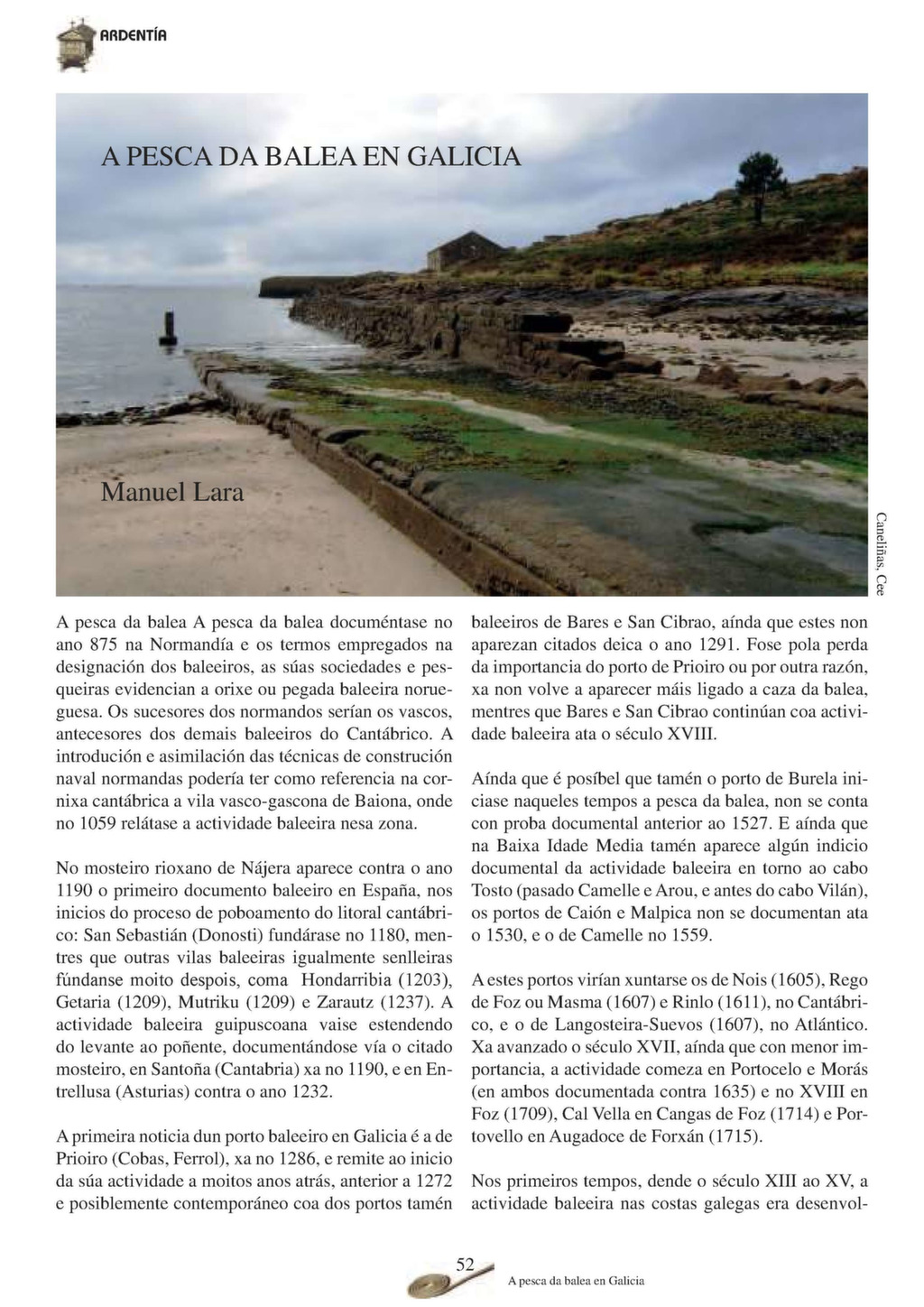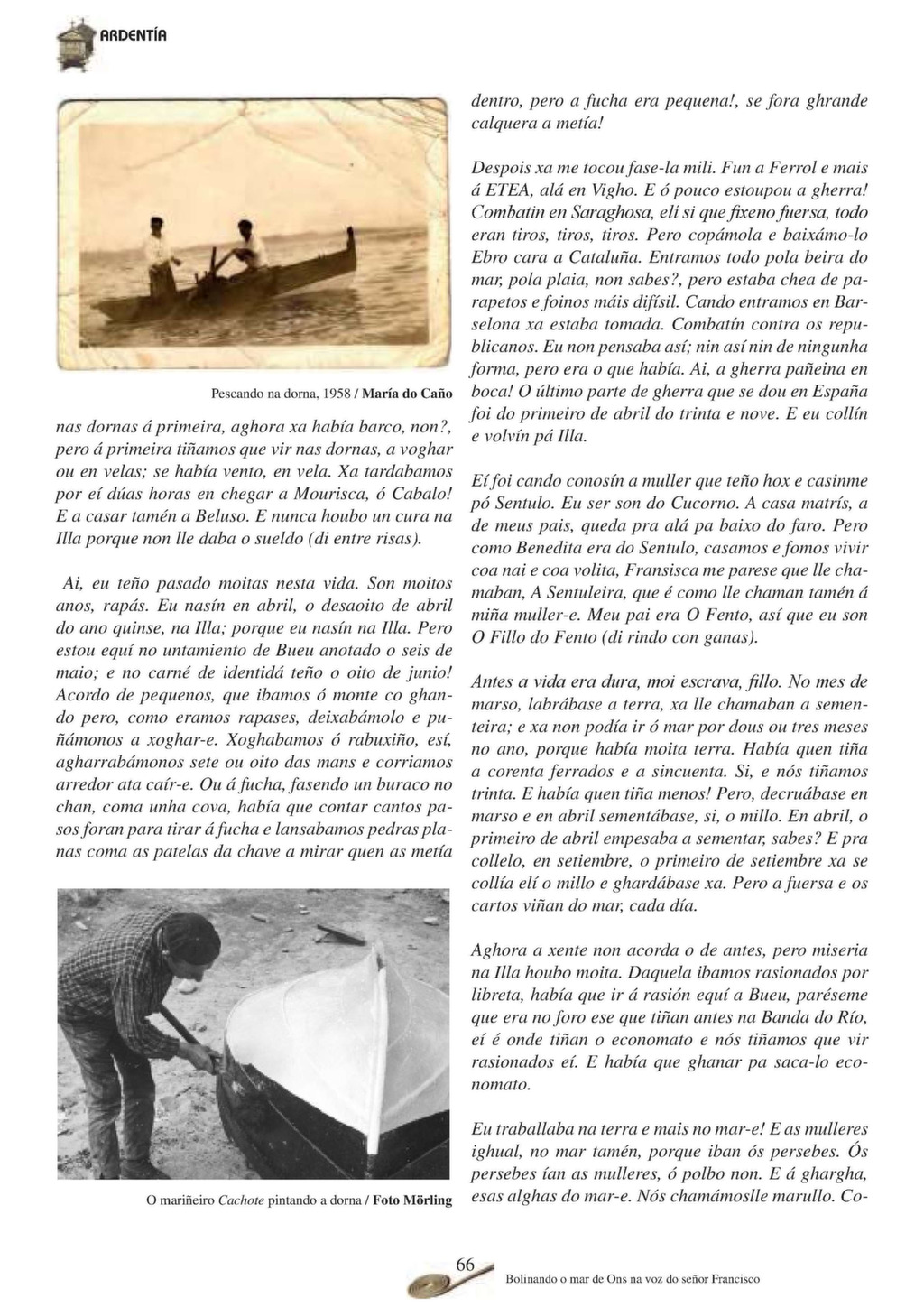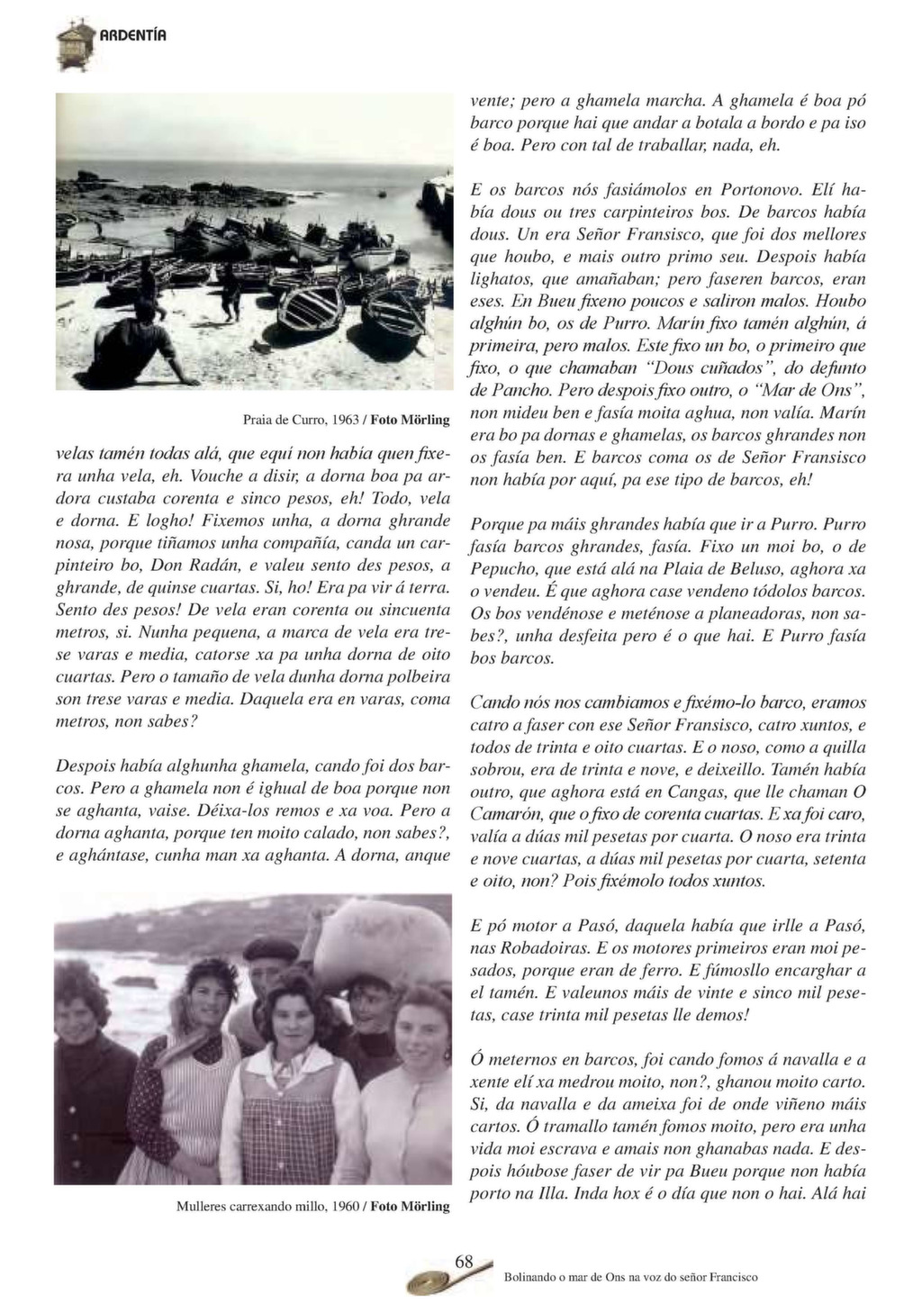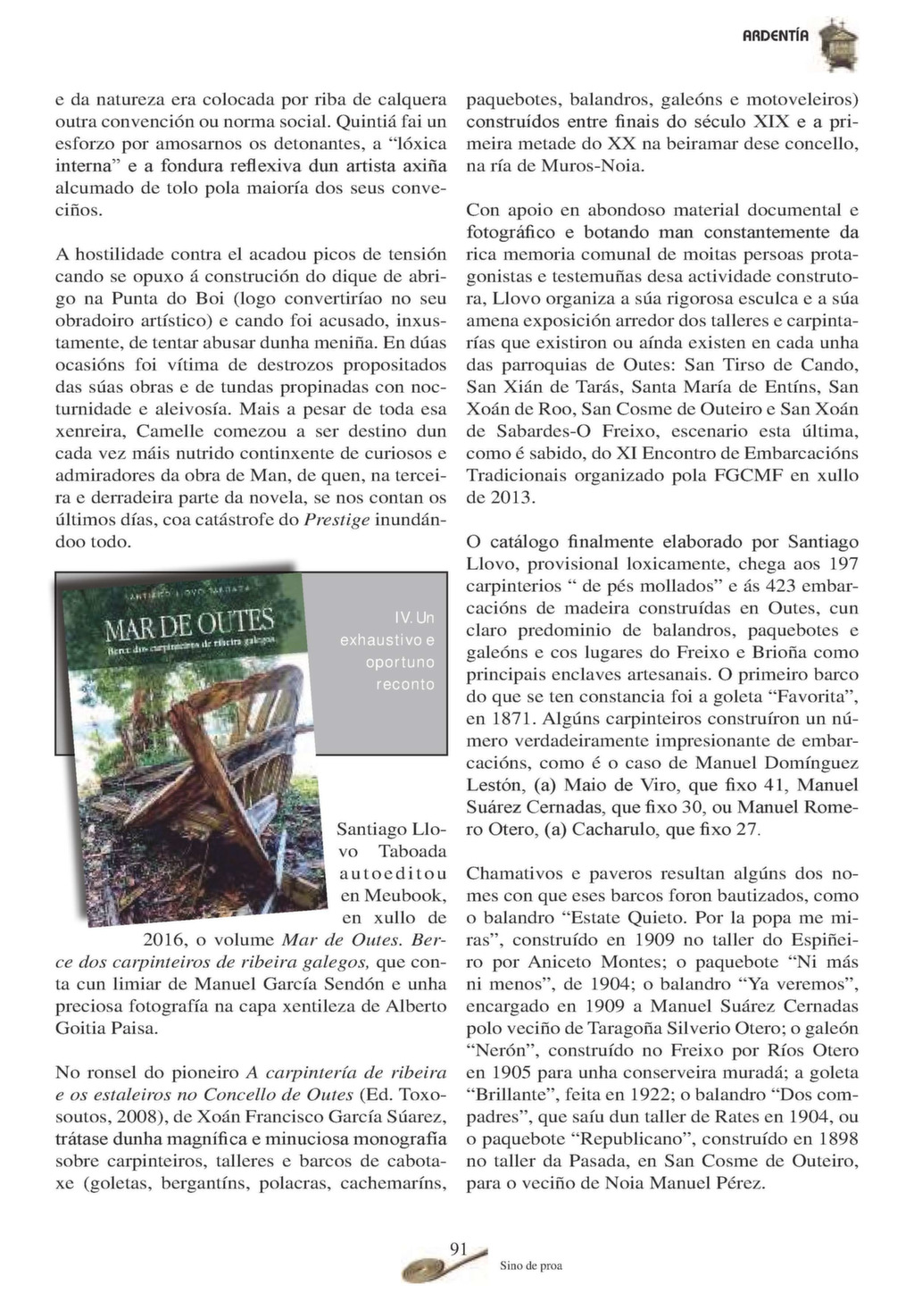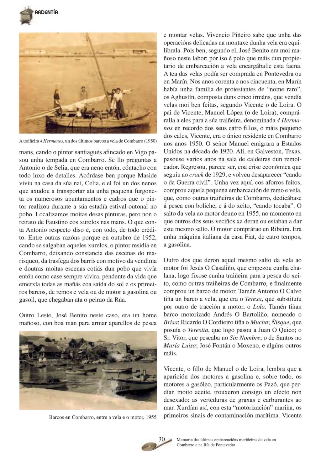 A Atalaia | A nova singradura de Ardentía, co patrón Luís Rei no Leme | Luís Rei e a revista Ardentía: unha experiencia impagábel de divulgación da nosa cultura marítima e fluvial | O mar; punto de encontro | Furtivos | Percorrendo a historia da illa de Tambo | Memoria das últimas embarcacións mariñeiras de vela en Combarro e na Ría de Pontevedra | O Penendo dos Ladróns; un novo xacemento paleolítico da comarca do Condado | Traíñas, xeitos, traiñeiras e tarrafas. A rendabilidade industrial contra a cultura mariñeira | As paisagens do sargaço do norte de Portugal | A pesca da balea en Galicia | Nois na miña memoria | Bolinando o mar de Ons na voz do señor Francisco | As salgaduras de Portocubelo | O Ecomuseo de Arxeriz | Que inchadiña branca vela | Letras na almadraba | Pregón da Festa da Lamprea de Cesures | Sino de Proa | As orixes da gamela galega e da masseira portuguesa | Lecturas para navegantes | Pintores do mar: Maruja Mallo | As que navegan. Crónica sentimental do XII Encontro de Embarcacións Tradicionais de Galicia