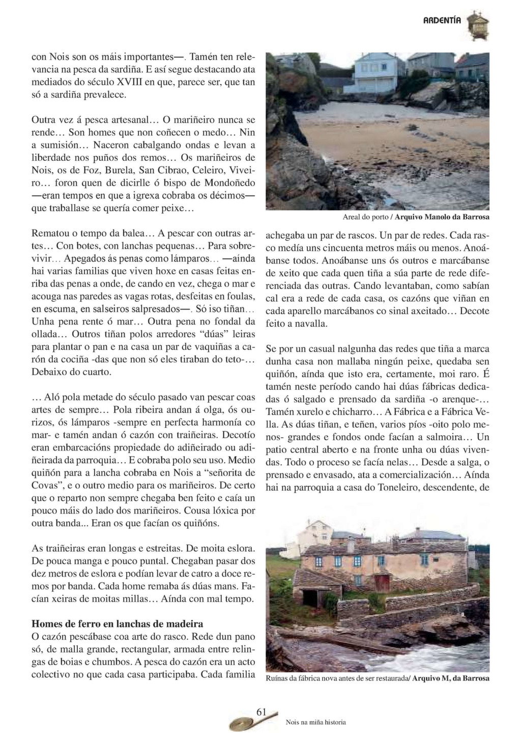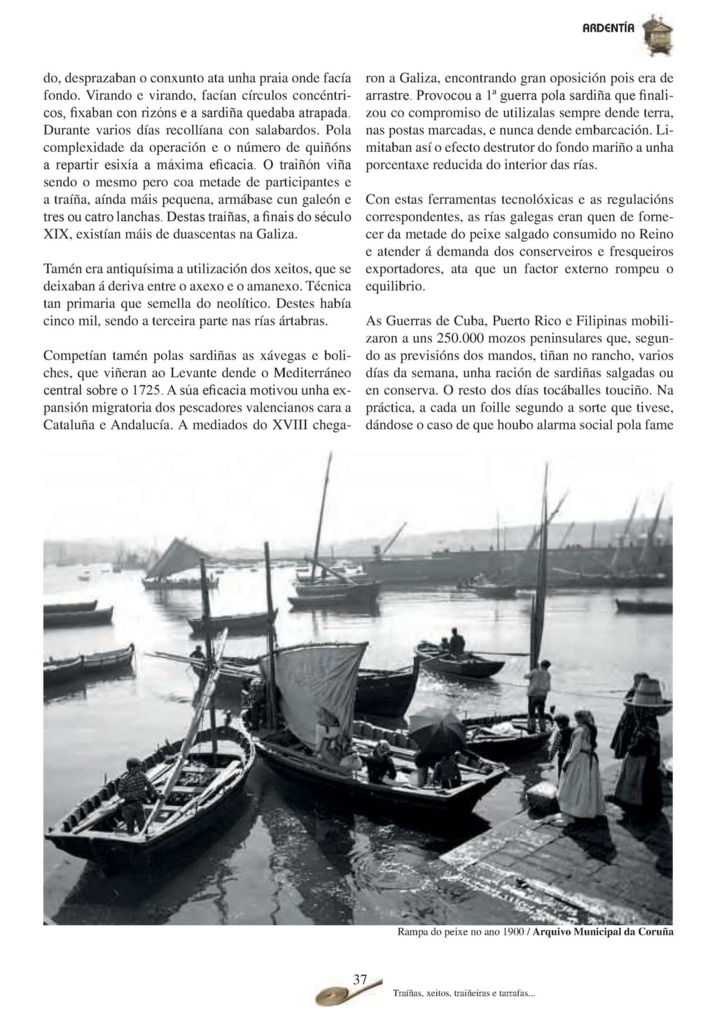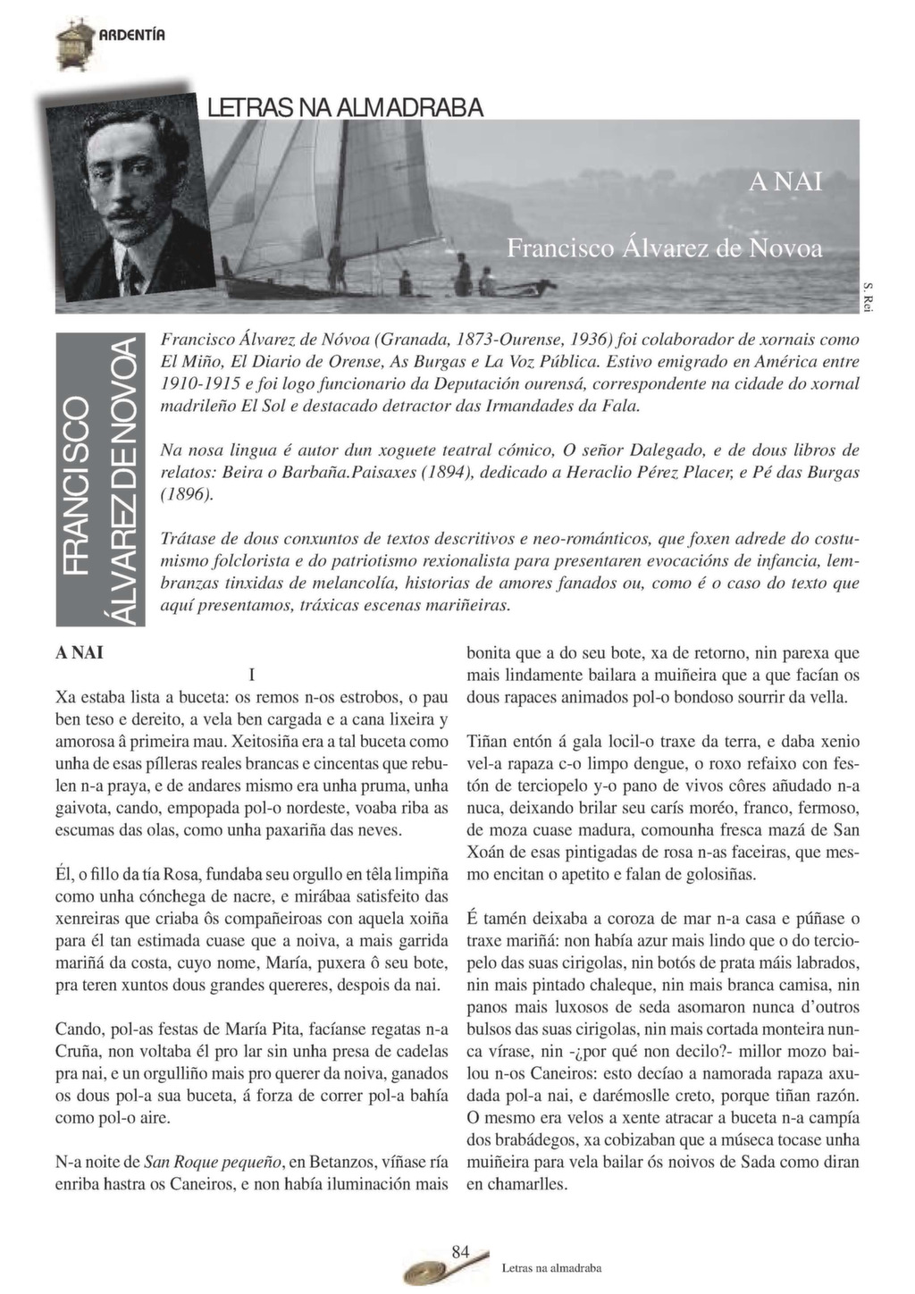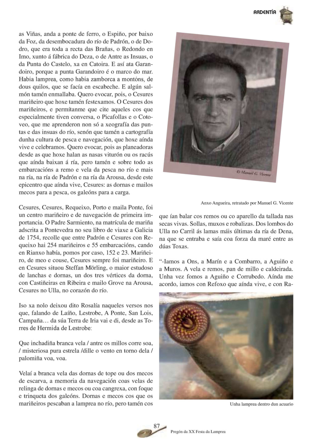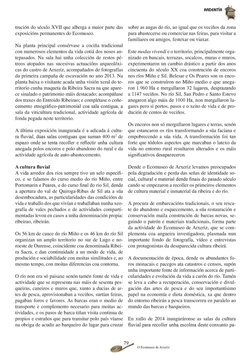 A Atalaia | A nova singradura de Ardentía, co patrón Luís Rei no Leme | Luís Rei e a revista Ardentía: unha experiencia impagábel de divulgación da nosa cultura marítima e fluvial | O mar; punto de encontro | Furtivos | Percorrendo a historia da illa de Tambo | Memoria das últimas embarcacións mariñeiras de vela en Combarro e na Ría de Pontevedra | O Penendo dos Ladróns; un novo xacemento paleolítico da comarca do Condado | Traíñas, xeitos, traiñeiras e tarrafas. A rendabilidade industrial contra a cultura mariñeira | As paisagens do sargaço do norte de Portugal | A pesca da balea en Galicia | Nois na miña memoria | Bolinando o mar de Ons na voz do señor Francisco | As salgaduras de Portocubelo | O Ecomuseo de Arxeriz | Que inchadiña branca vela | Letras na almadraba | Pregón da Festa da Lamprea de Cesures | Sino de Proa | As orixes da gamela galega e da masseira portuguesa | Lecturas para navegantes | Pintores do mar: Maruja Mallo | As que navegan. Crónica sentimental do XII Encontro de Embarcacións Tradicionais de Galicia