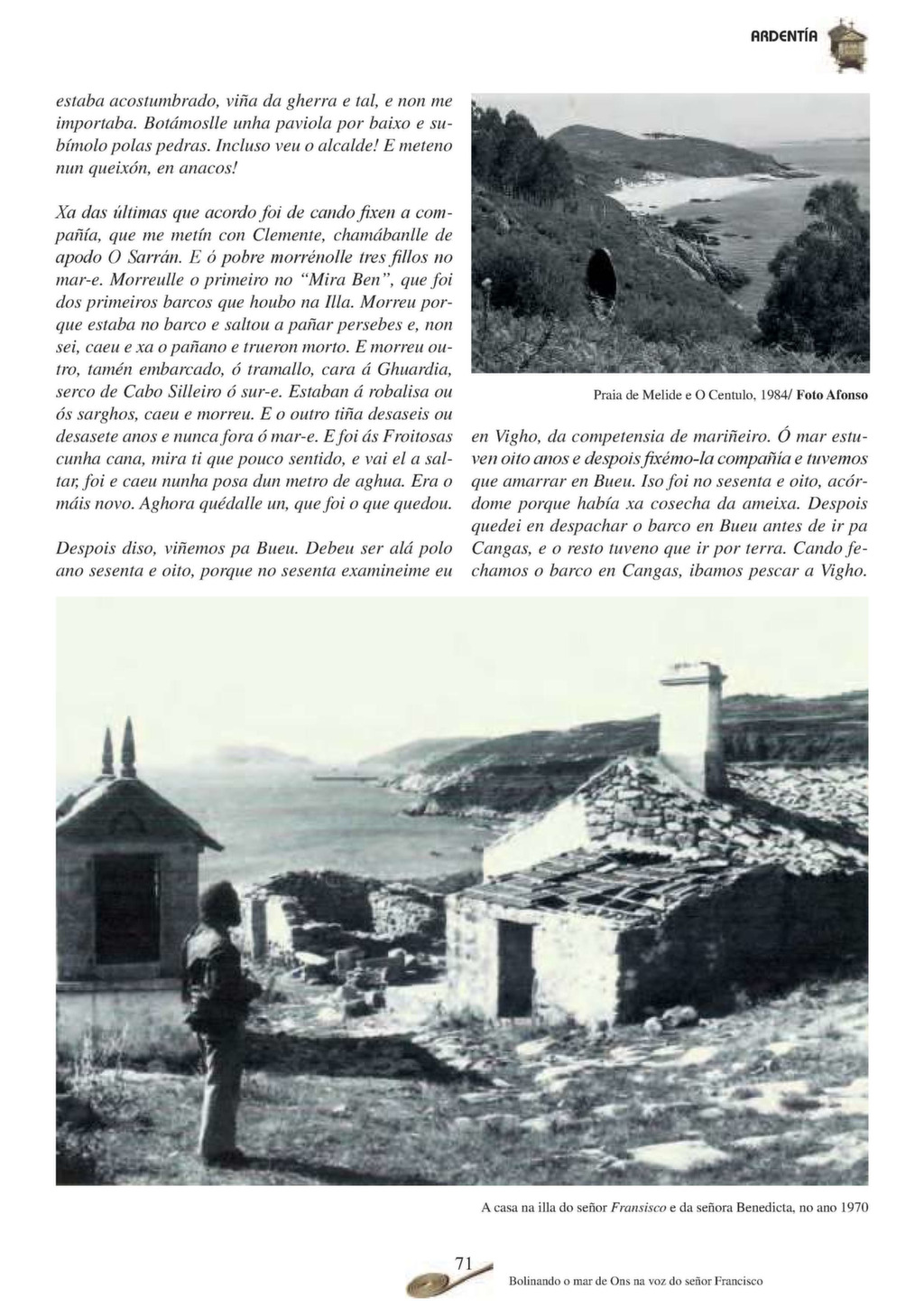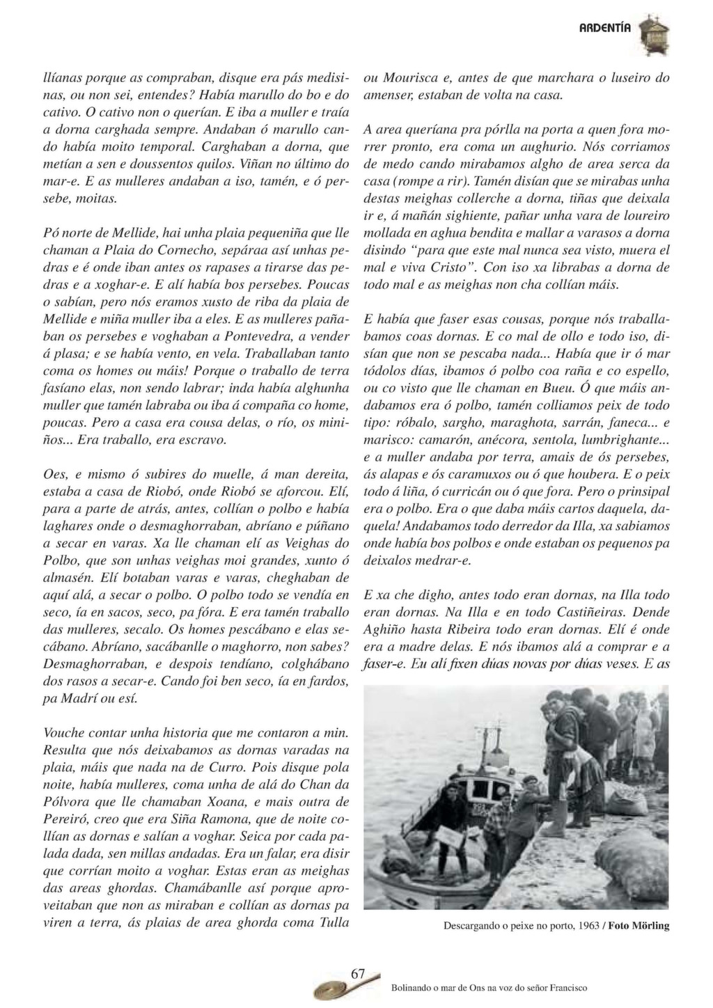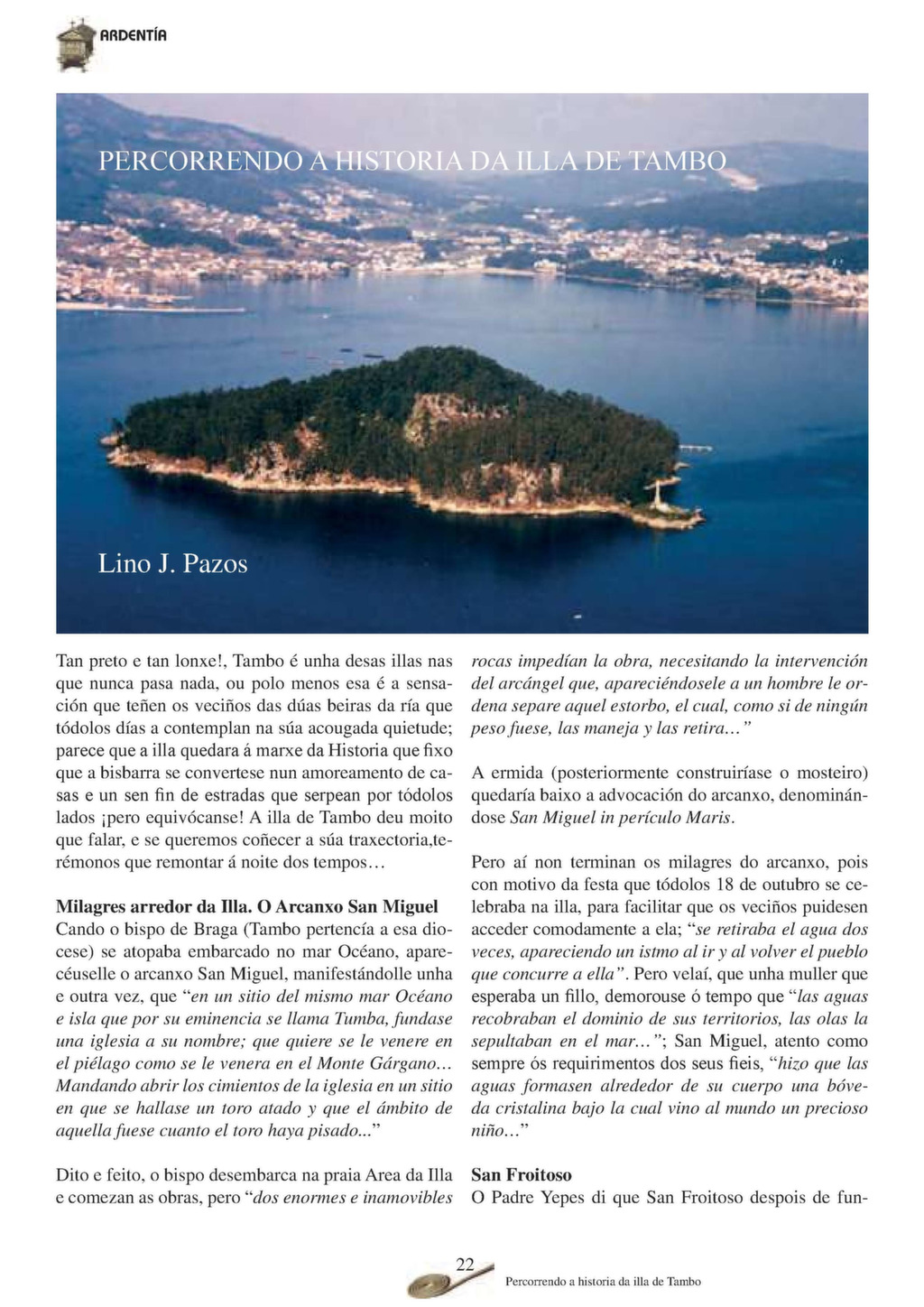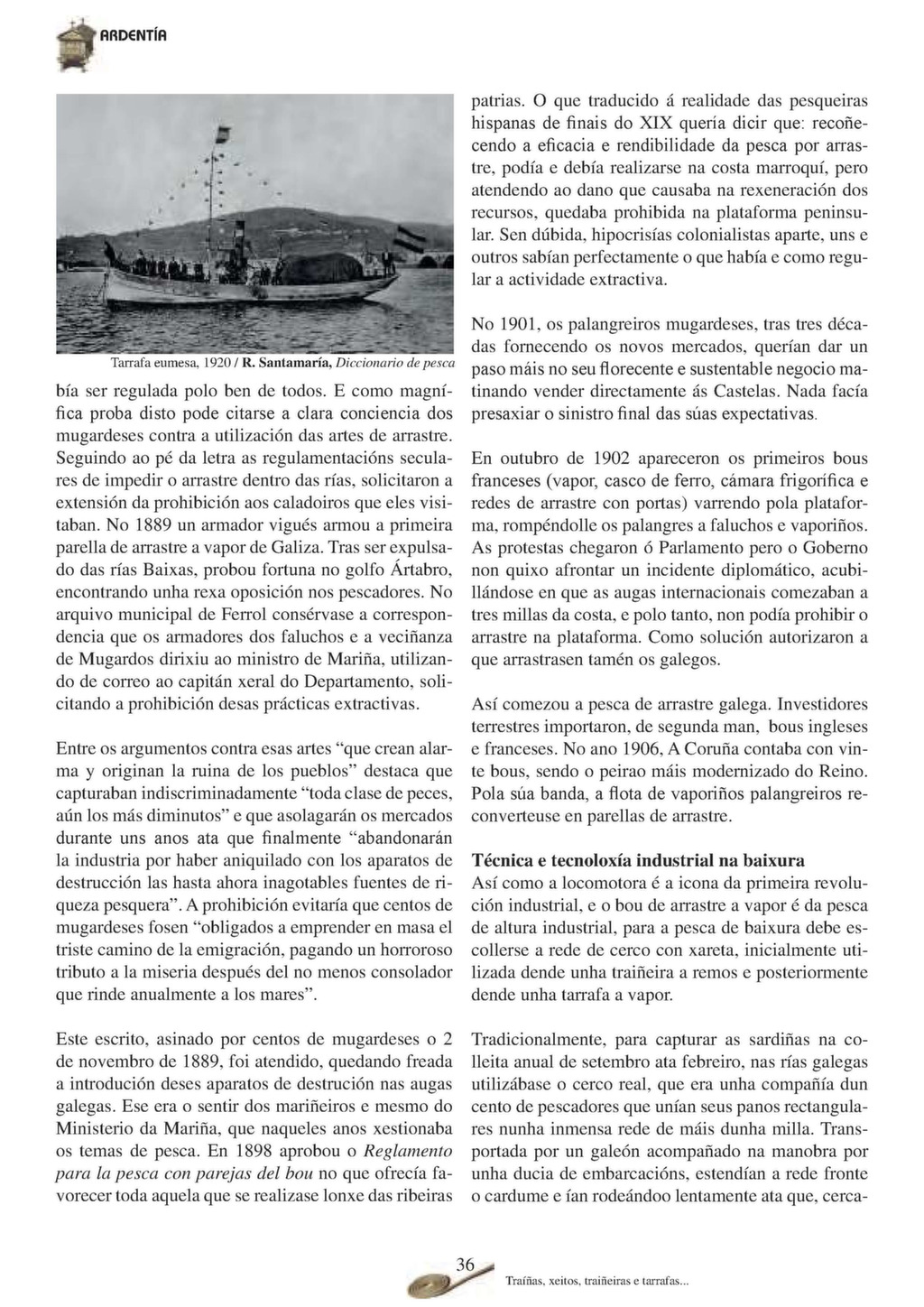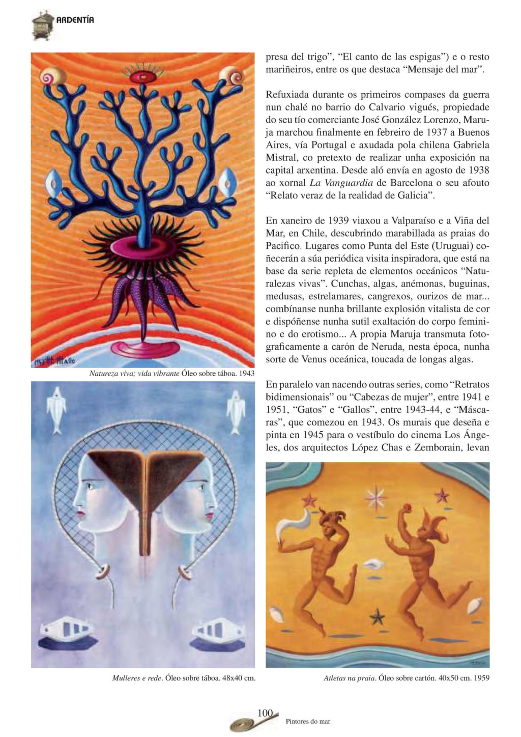 A Atalaia | A nova singradura de Ardentía, co patrón Luís Rei no Leme | Luís Rei e a revista Ardentía: unha experiencia impagábel de divulgación da nosa cultura marítima e fluvial | O mar; punto de encontro | Furtivos | Percorrendo a historia da illa de Tambo | Memoria das últimas embarcacións mariñeiras de vela en Combarro e na Ría de Pontevedra | O Penendo dos Ladróns; un novo xacemento paleolítico da comarca do Condado | Traíñas, xeitos, traiñeiras e tarrafas. A rendabilidade industrial contra a cultura mariñeira | As paisagens do sargaço do norte de Portugal | A pesca da balea en Galicia | Nois na miña memoria | Bolinando o mar de Ons na voz do señor Francisco | As salgaduras de Portocubelo | O Ecomuseo de Arxeriz | Que inchadiña branca vela | Letras na almadraba | Pregón da Festa da Lamprea de Cesures | Sino de Proa | As orixes da gamela galega e da masseira portuguesa | Lecturas para navegantes | Pintores do mar: Maruja Mallo | As que navegan. Crónica sentimental do XII Encontro de Embarcacións Tradicionais de Galicia