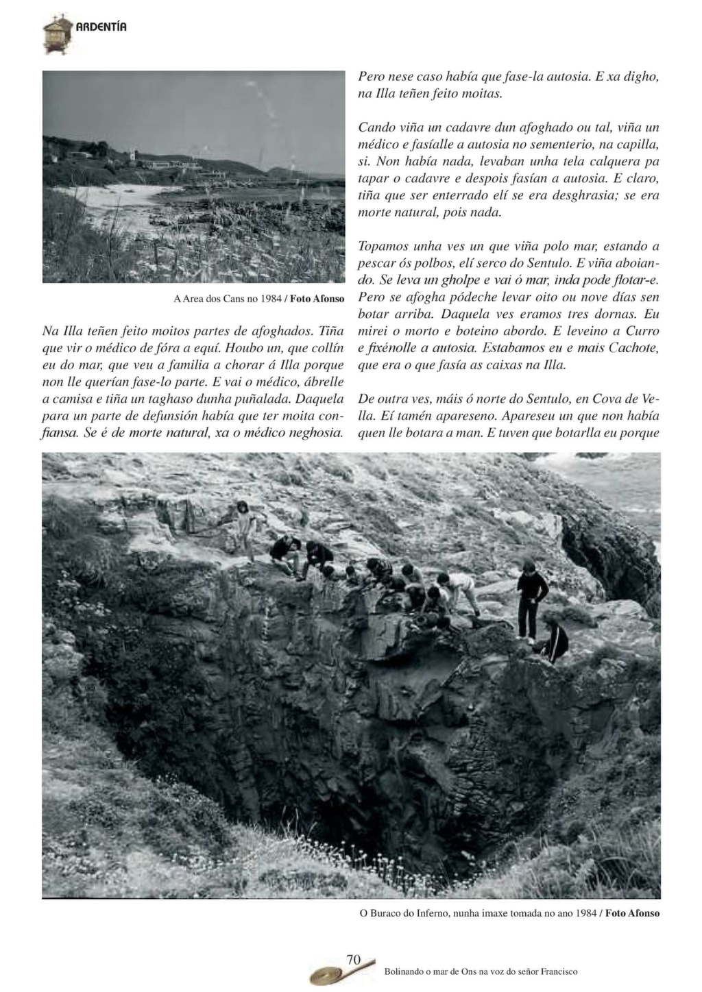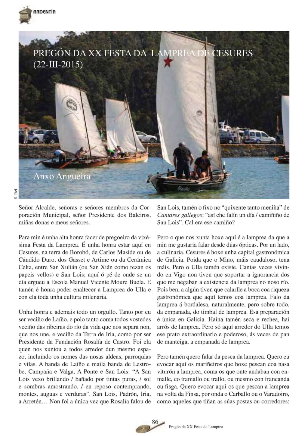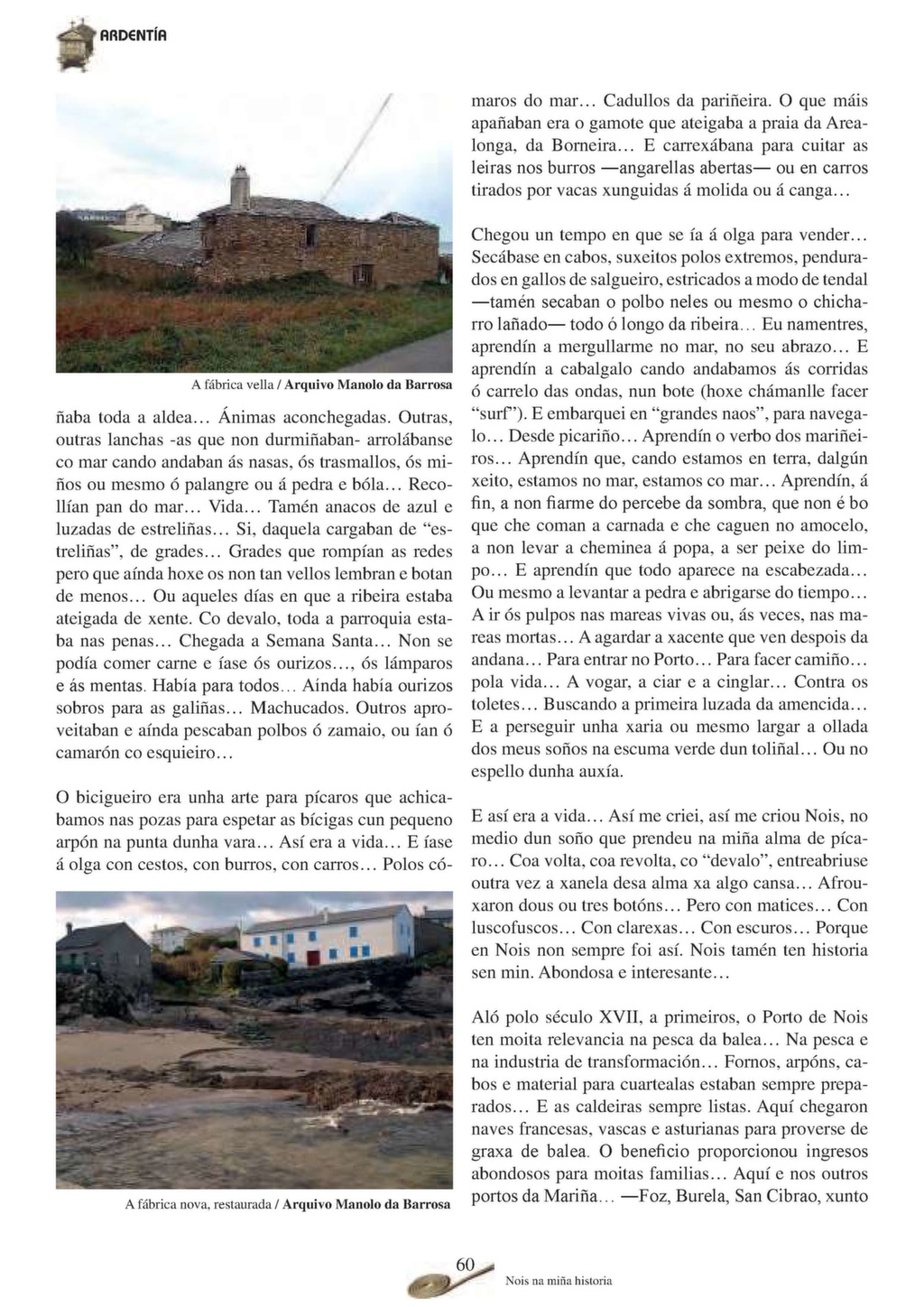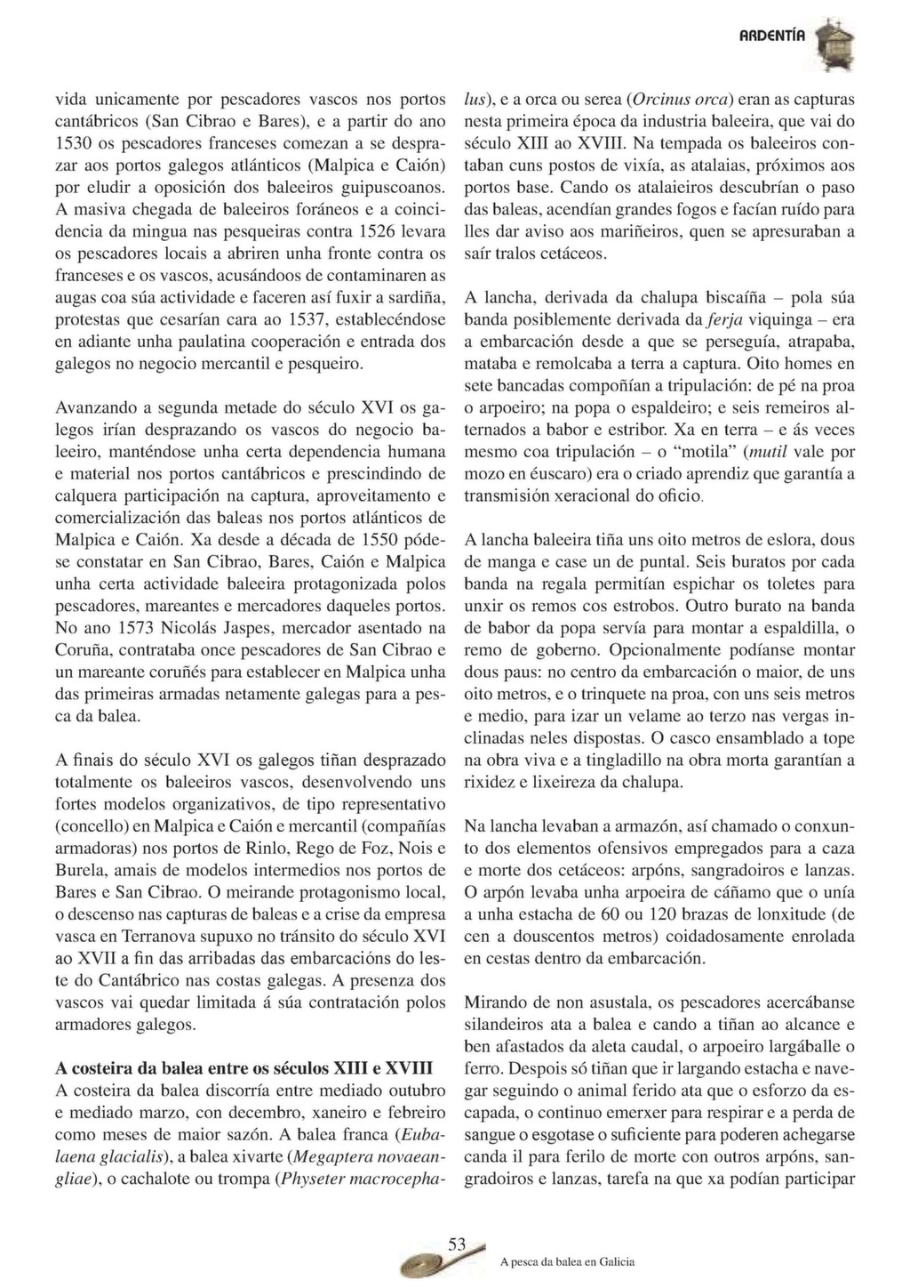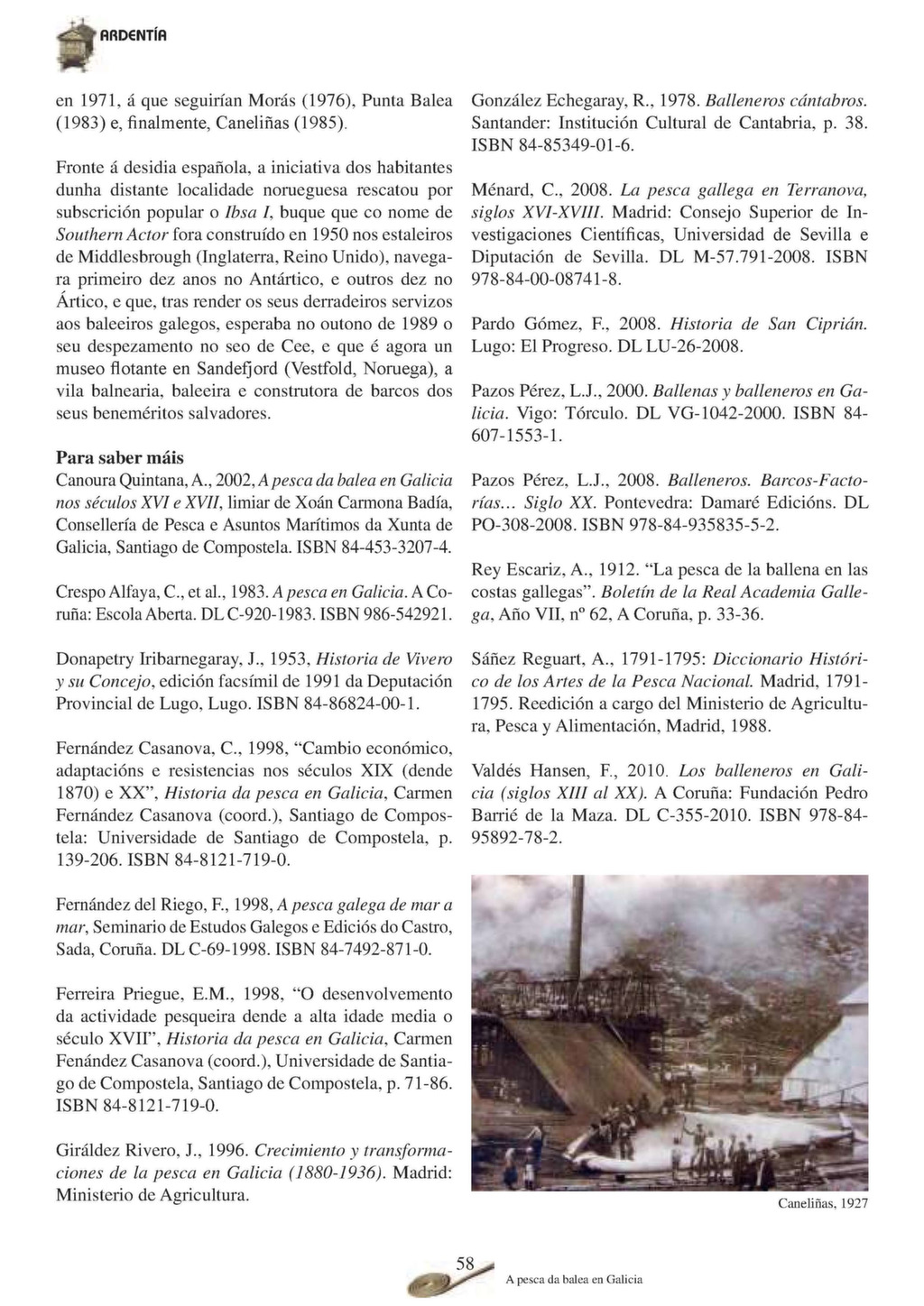 A Atalaia | A nova singradura de Ardentía, co patrón Luís Rei no Leme | Luís Rei e a revista Ardentía: unha experiencia impagábel de divulgación da nosa cultura marítima e fluvial | O mar; punto de encontro | Furtivos | Percorrendo a historia da illa de Tambo | Memoria das últimas embarcacións mariñeiras de vela en Combarro e na Ría de Pontevedra | O Penendo dos Ladróns; un novo xacemento paleolítico da comarca do Condado | Traíñas, xeitos, traiñeiras e tarrafas. A rendabilidade industrial contra a cultura mariñeira | As paisagens do sargaço do norte de Portugal | A pesca da balea en Galicia | Nois na miña memoria | Bolinando o mar de Ons na voz do señor Francisco | As salgaduras de Portocubelo | O Ecomuseo de Arxeriz | Que inchadiña branca vela | Letras na almadraba | Pregón da Festa da Lamprea de Cesures | Sino de Proa | As orixes da gamela galega e da masseira portuguesa | Lecturas para navegantes | Pintores do mar: Maruja Mallo | As que navegan. Crónica sentimental do XII Encontro de Embarcacións Tradicionais de Galicia