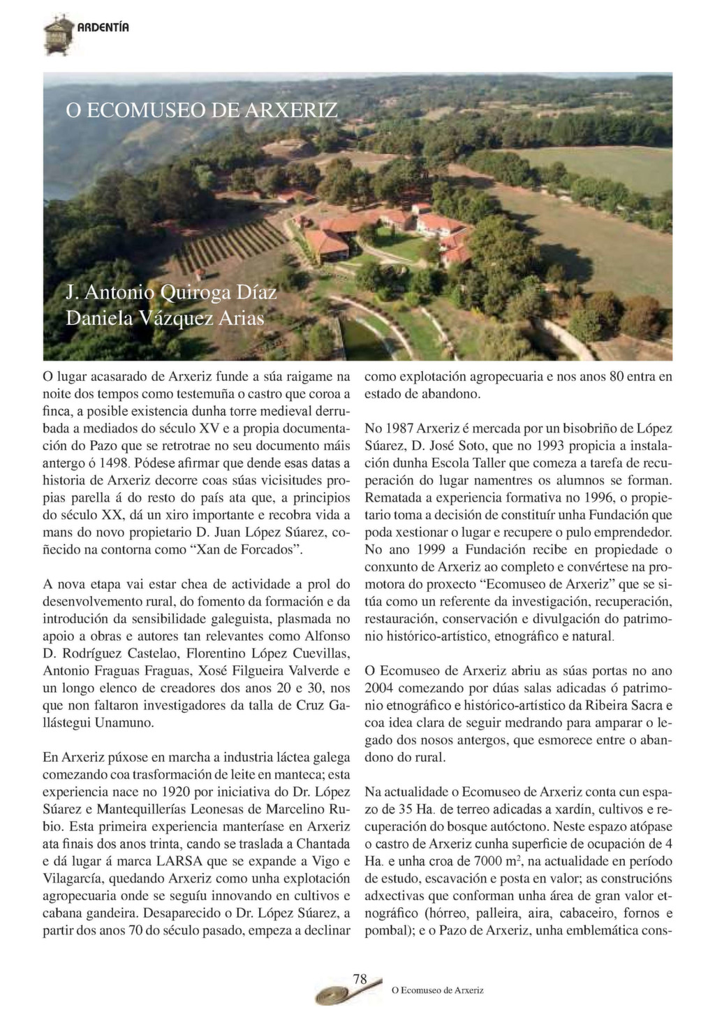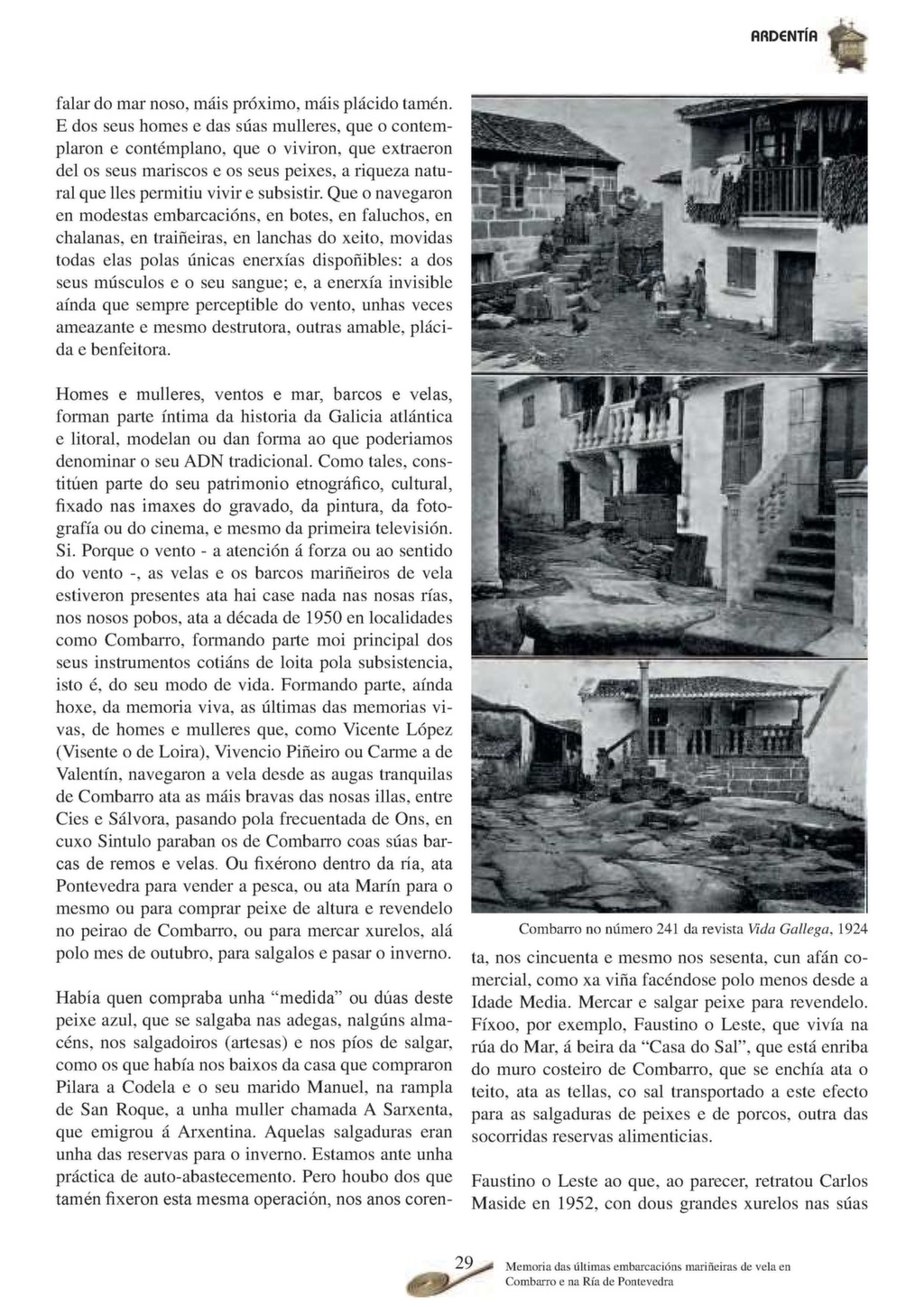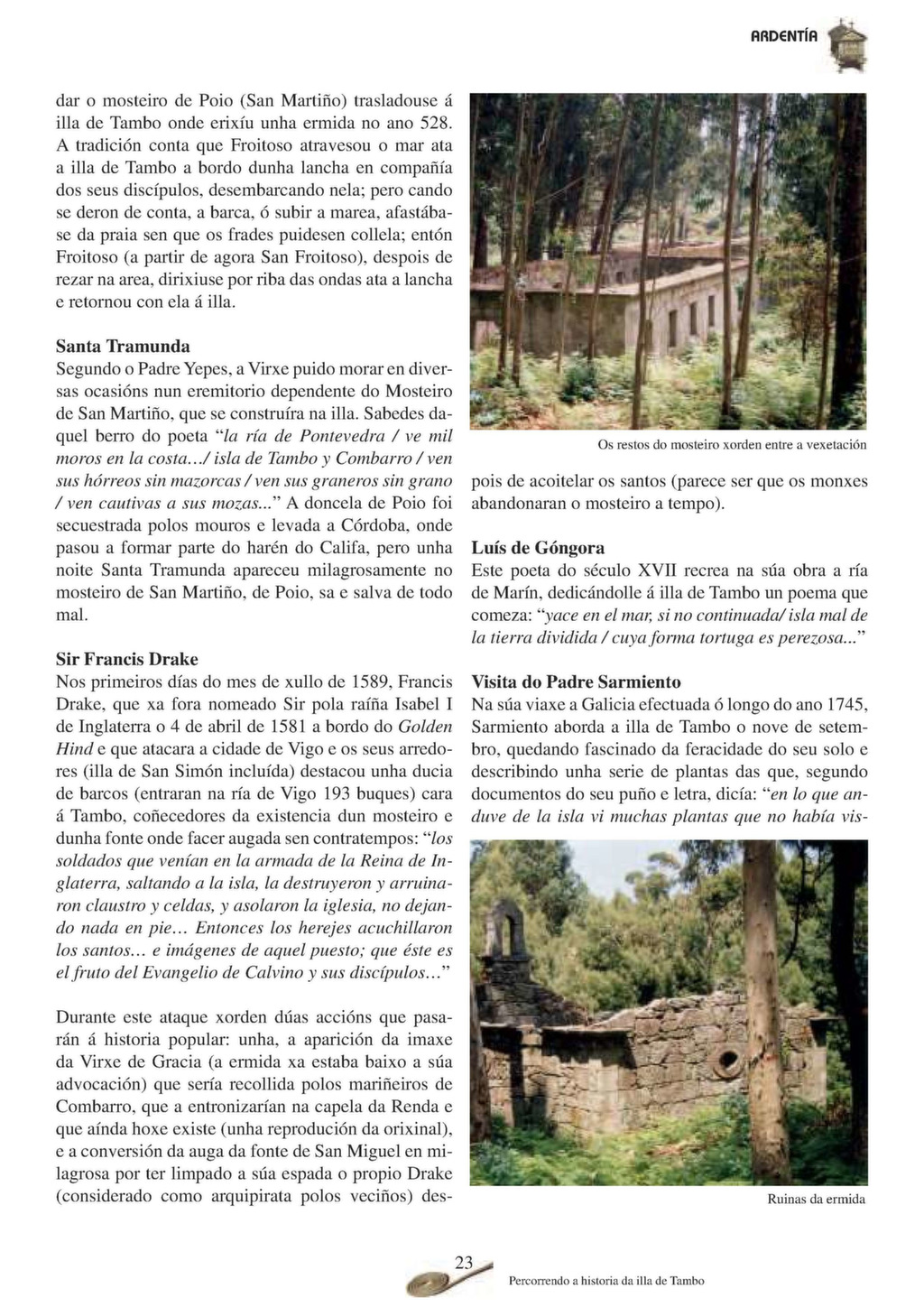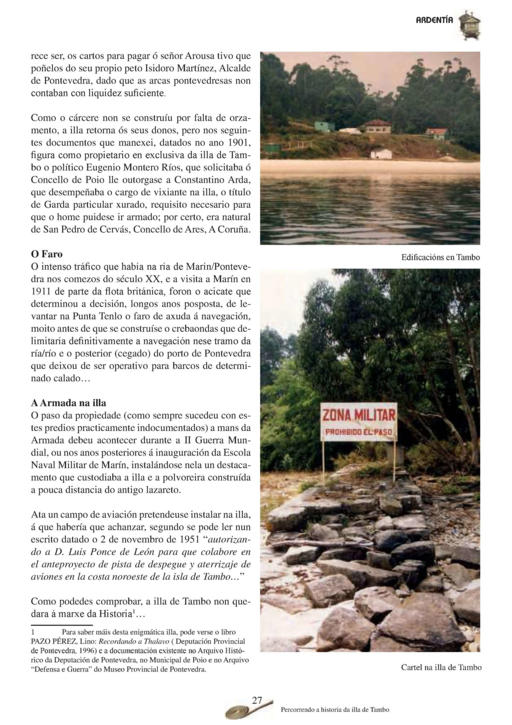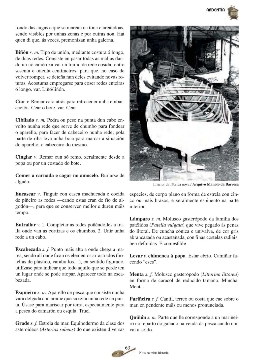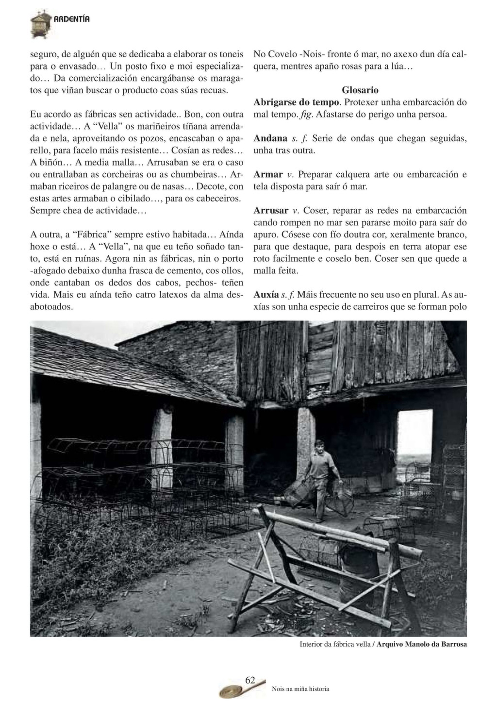 A Atalaia | A nova singradura de Ardentía, co patrón Luís Rei no Leme | Luís Rei e a revista Ardentía: unha experiencia impagábel de divulgación da nosa cultura marítima e fluvial | O mar; punto de encontro | Furtivos | Percorrendo a historia da illa de Tambo | Memoria das últimas embarcacións mariñeiras de vela en Combarro e na Ría de Pontevedra | O Penendo dos Ladróns; un novo xacemento paleolítico da comarca do Condado | Traíñas, xeitos, traiñeiras e tarrafas. A rendabilidade industrial contra a cultura mariñeira | As paisagens do sargaço do norte de Portugal | A pesca da balea en Galicia | Nois na miña memoria | Bolinando o mar de Ons na voz do señor Francisco | As salgaduras de Portocubelo | O Ecomuseo de Arxeriz | Que inchadiña branca vela | Letras na almadraba | Pregón da Festa da Lamprea de Cesures | Sino de Proa | As orixes da gamela galega e da masseira portuguesa | Lecturas para navegantes | Pintores do mar: Maruja Mallo | As que navegan. Crónica sentimental do XII Encontro de Embarcacións Tradicionais de Galicia