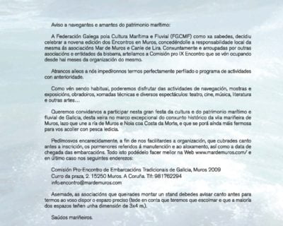 Invitación formal ao IX Encontro de Embarcacións Tradicionais de Galicia. Muros 2009