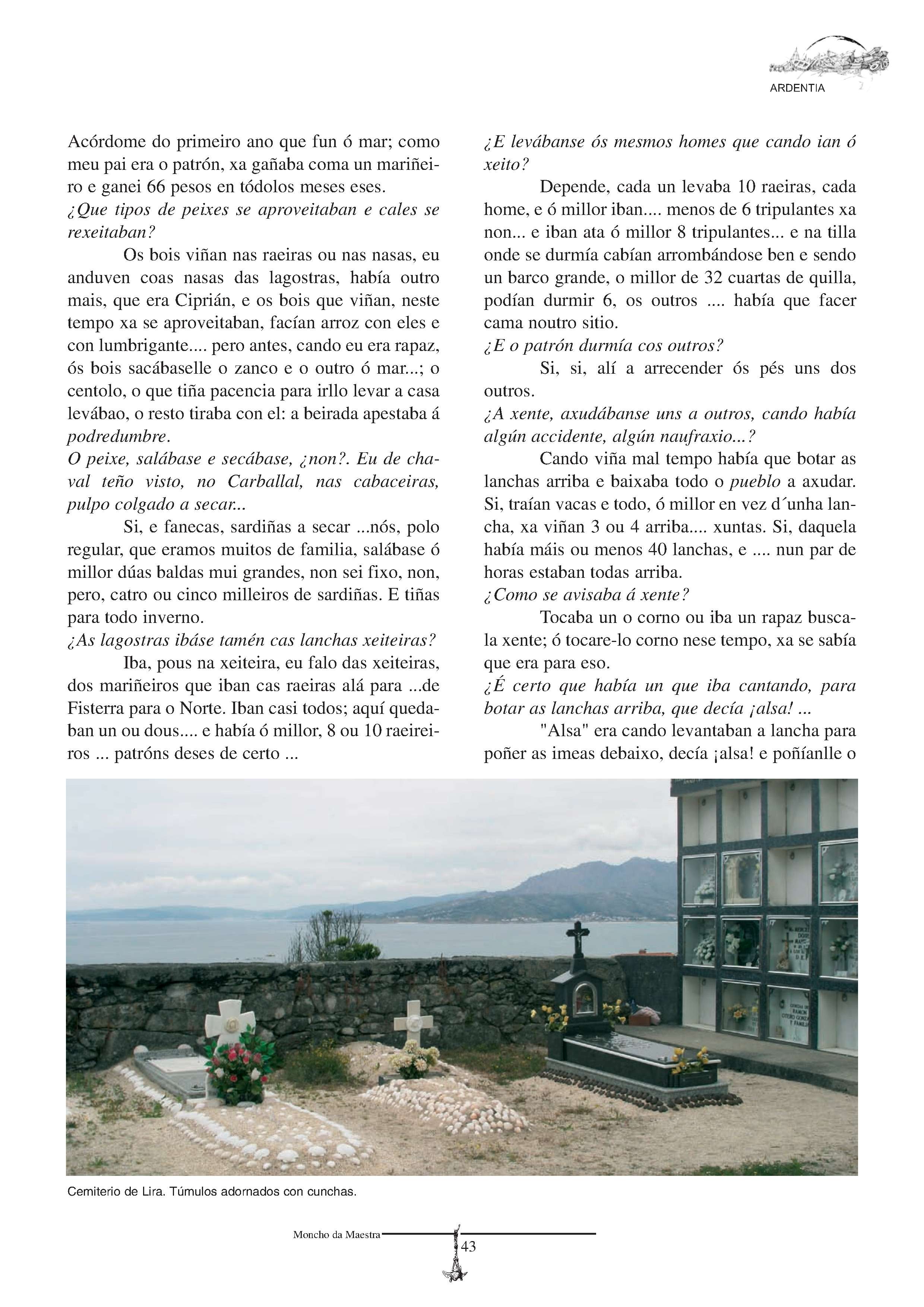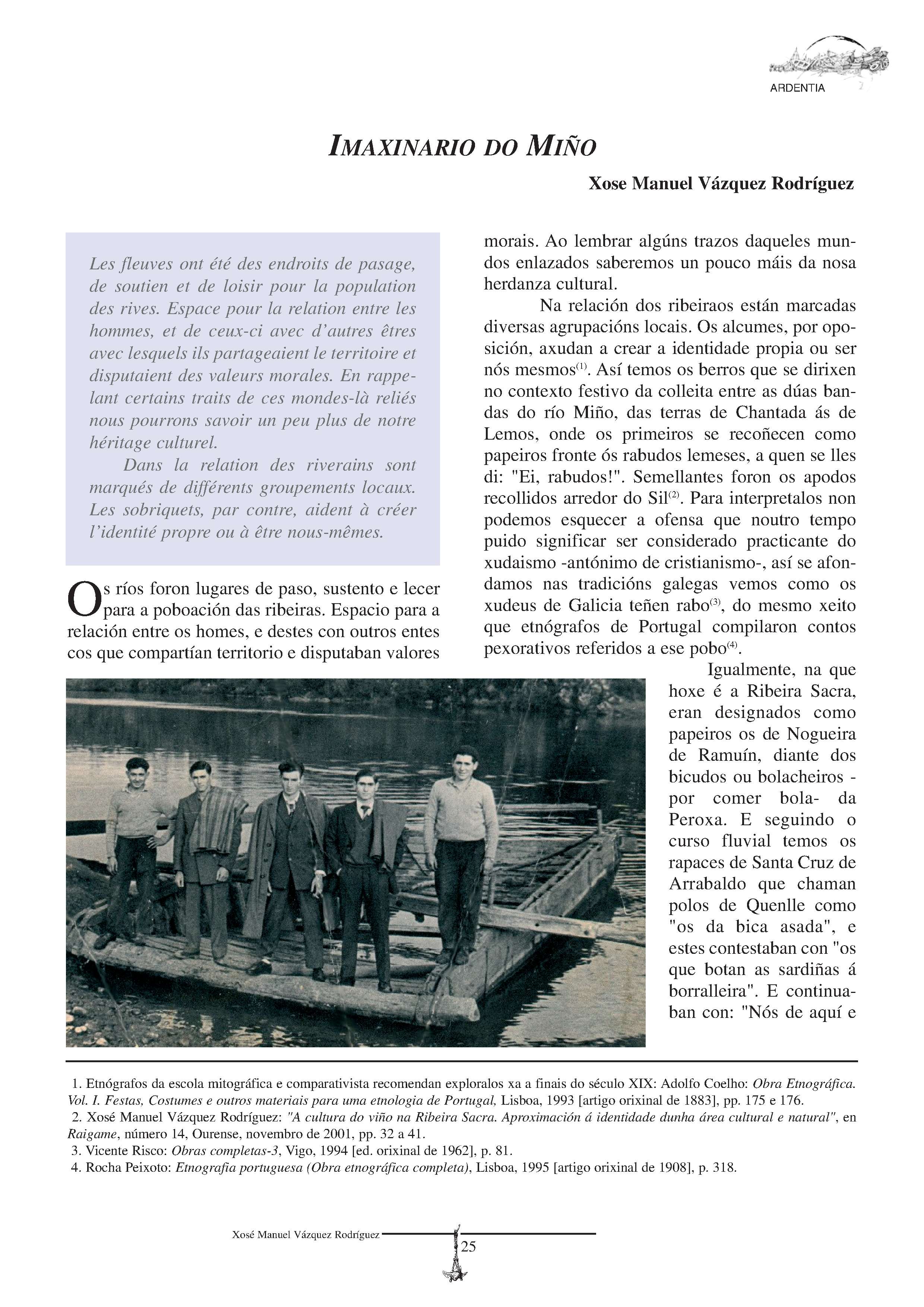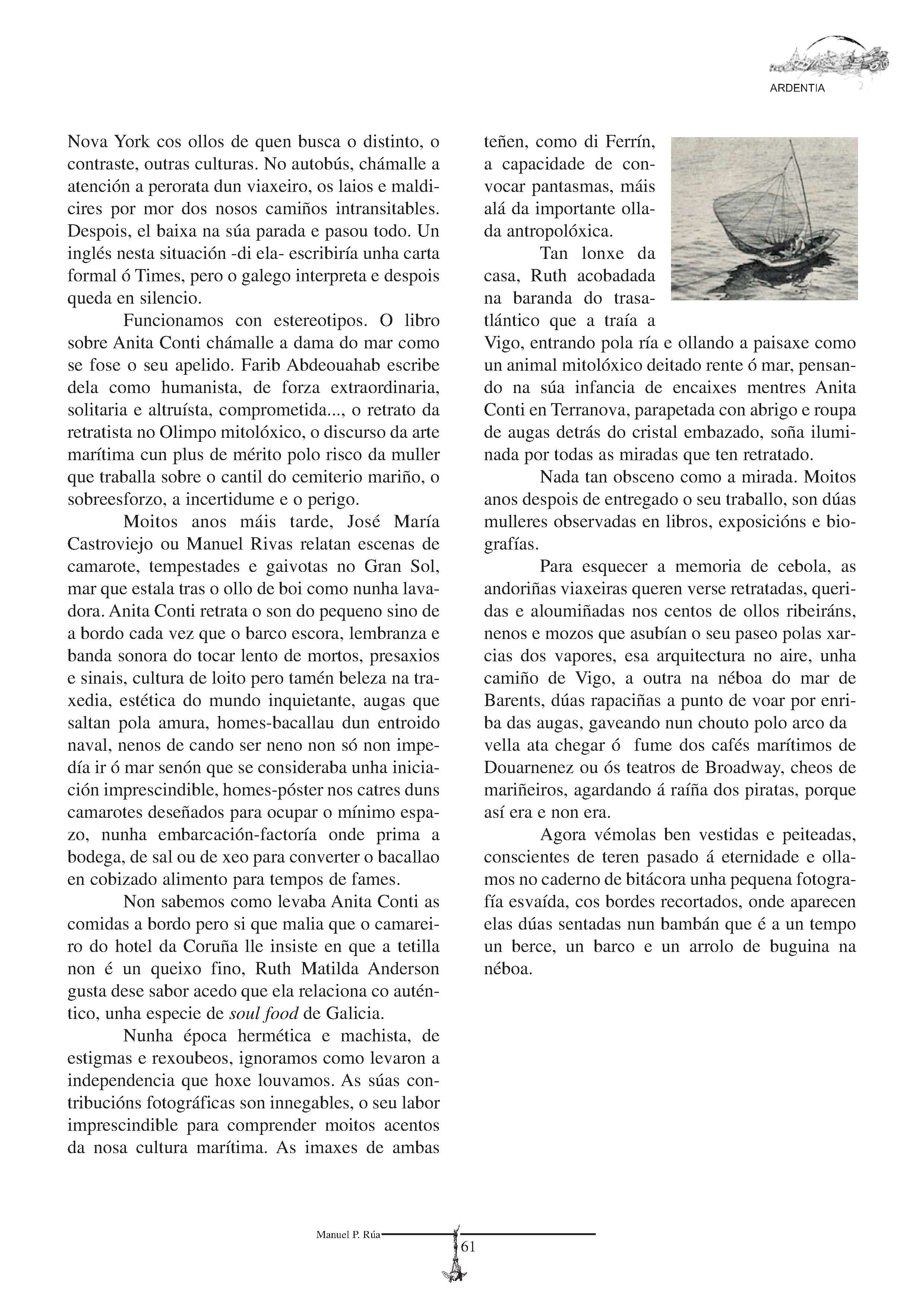 Collendo Corso | A Atalaia | Homenaxe aos náufragos do Bahía | Expedición a Douarnenez | Un patrimonio común galego-portugués | Mãos do mar | Alimentación simboloxía e identidade | Imaxinario do Miño | Xoaquin Lourenzo e a cultura marítima | Estaleiros navais artesanais de madeira no norte de Portugal. Sobrevivencia ou reconversão | Entrevista a Ramón Senade (Moncho da Maestra) | Andisías e rutías: Mar de mar e mar de vebnto na Arousa e na Costa da Marte | Memorias de mar e cebola | ¿Por que en beiramar herdan a casa as mulleres? | Breves apuntamentos sobre a especificidade do home de mar |Morfoloxía e análise do sistema folclórico tradicional de Galicia | A sociabilidade mariñeira. Asociacionismo e distribución da pesca na beiramar galega | Pintores do mar: Eduardo Baamonde.