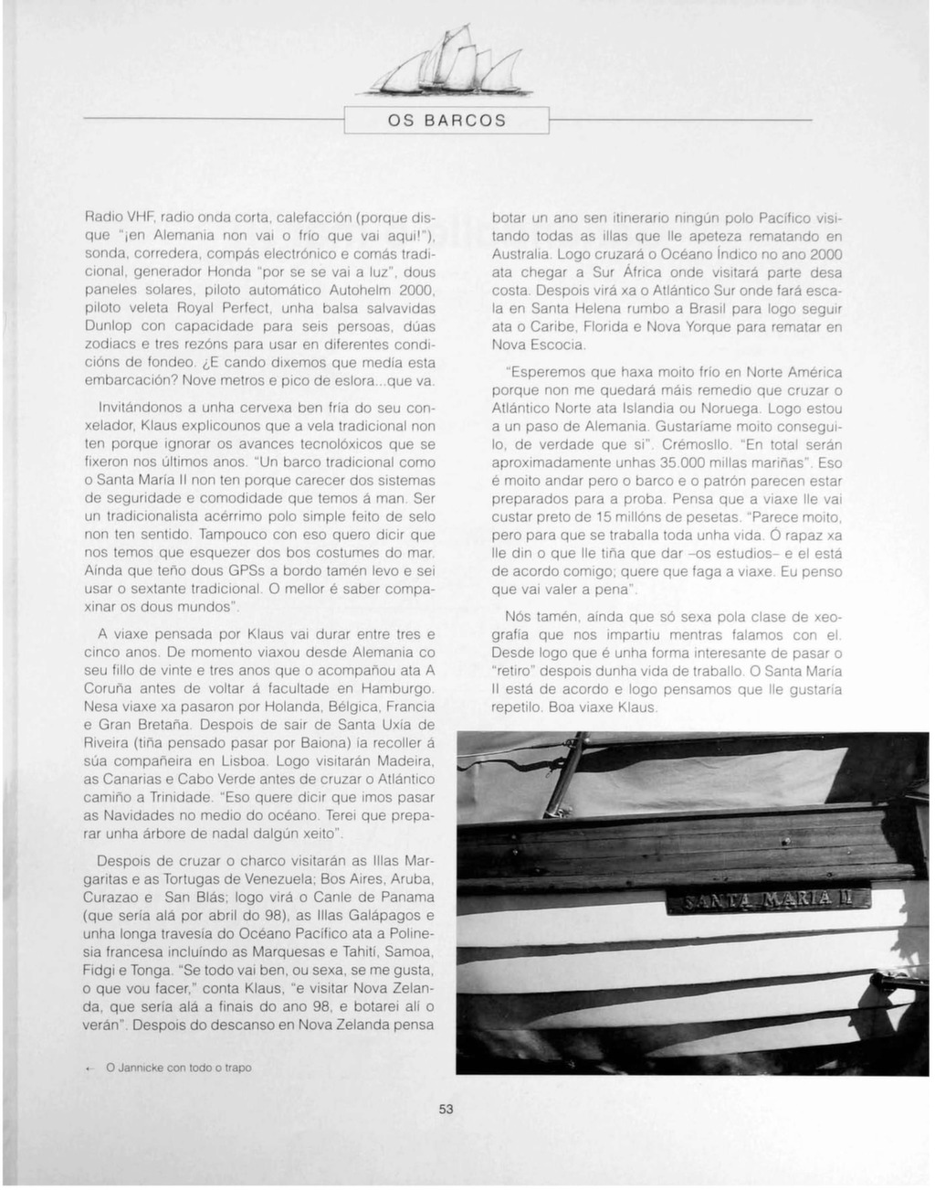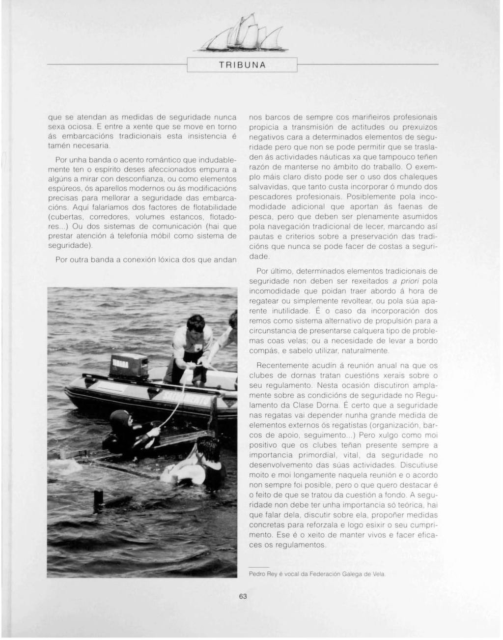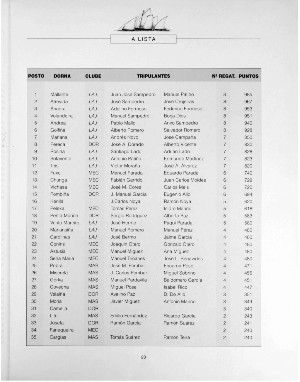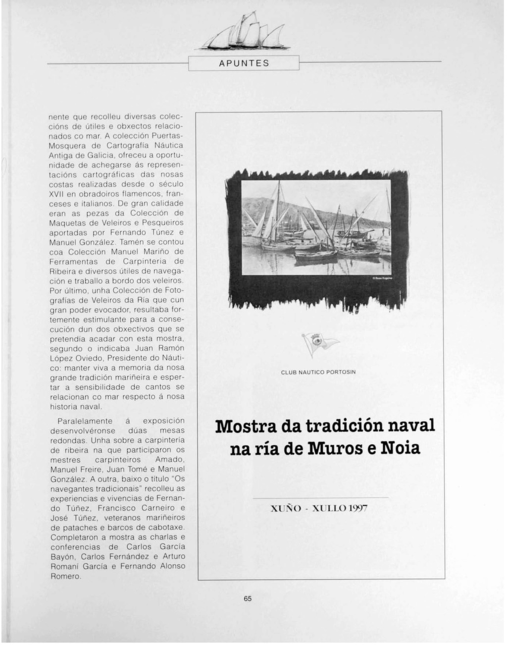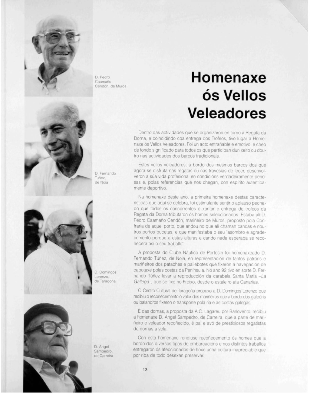 Editorial. Levantar o voo | Memoria | Encontros. Galicia-97. Encontro de tradicións mariñeiras | Regata da Dorna. A tradicional Regata da Dorna cobra perfís singulares. Unha vella regata anovada | Homenaxe ós Vellos veleadores | Volta á Illa. A Volta á Illa xunta a todos | Regata da Miserela. Na Miserela decidiuse o Campionato Galego | Regata do Cotelo. Consolidase o Trofeo de Castiñeiras | Encontros en Ferrol. A “vela clásica” de Ferrol | Ría do Eo. Os botes de Ribadeo | A lista de 1997. O circuíto de dornas | A lista | Campionato Galego | Os Campións. Alberto e José Antonio abandeiran unha nova xeración | Firmas. Por Suso de Toro | Ilustración de Vizoso | O mar nos museos. O Museo do Pobo Galego | Costumes e tradicións. As corridas de arroases | O medio natural. Illas Cíes. Parque Natural | A fala. Coñece-lo mar e coñece-lo ceo | Os barcos. Os Colin Archers. Veleiros con alma mariñeira | Escola de navegación. Gañándolle ó mar (I) | Crónicas da Cofradía. Asalto á Guadalupe | Tribuna. Seguridade no mar | Apuntes | Publicacións | Axenda